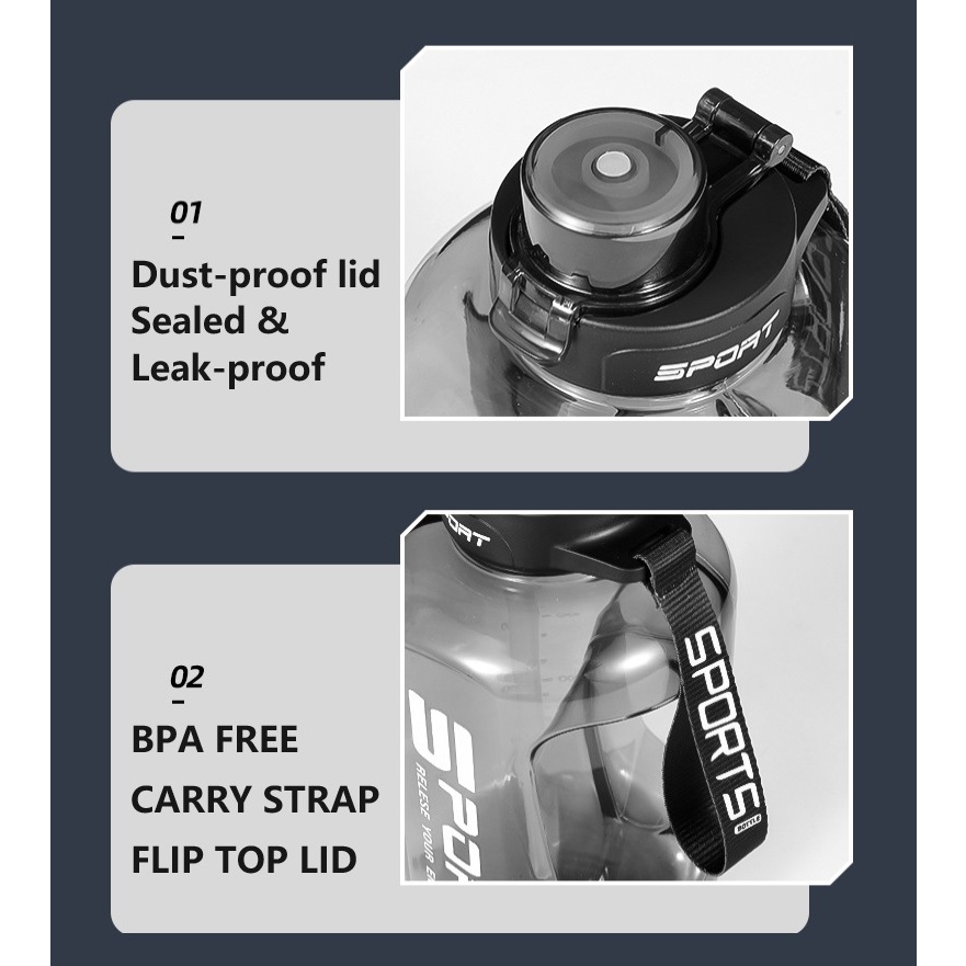 1.7L / 2.5L Large Capacity Sport Water Bottle Large Water Bottle c/w Strap Portable Plastic School BPA Free