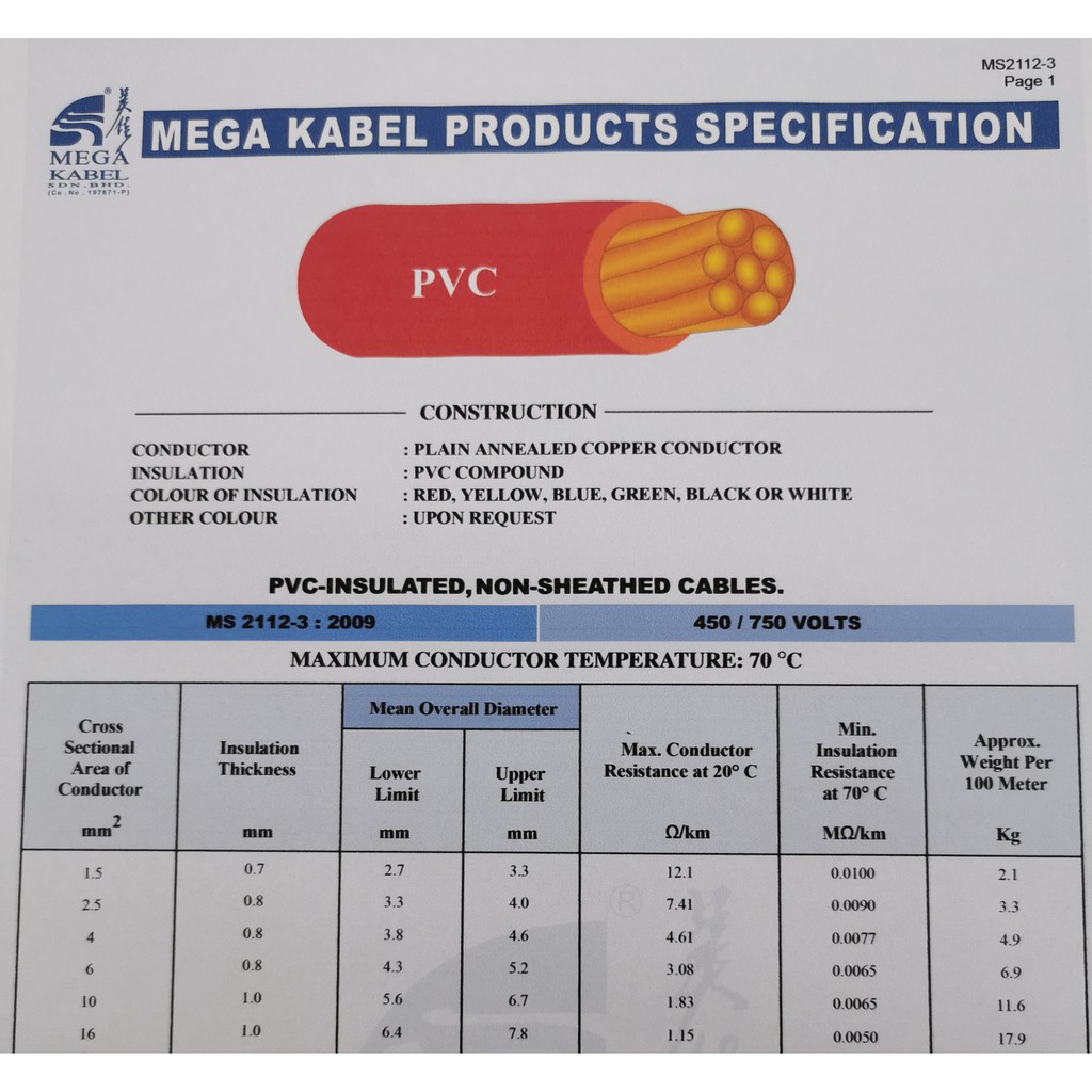 1 Meter MEGA KABEL 2.5mm PVC INSULATED CABLE 100% COPPER (SIRM & JKR APPROVED)