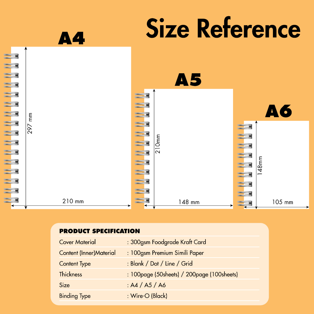 100 / 200 page Kraft Notebook | Buku Nota | Minimalist | A4 - A5 - A6 Size | Wire-O | Grid - Dot - Line - Blank
