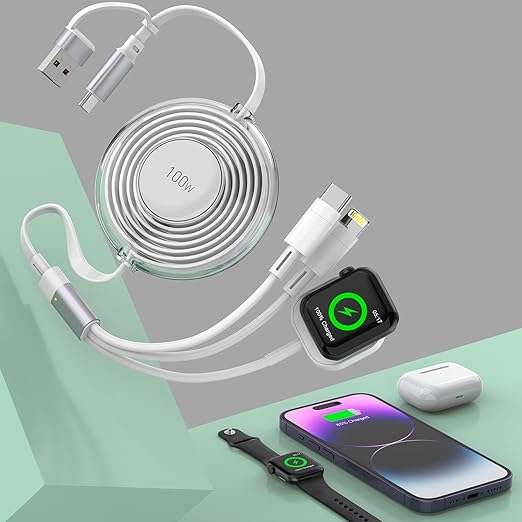 100W Retractable Multi 5-in-1 USB A/Type C to Lightning+USB C+Apple Watch Charger Cable,Super Fast Charging Cord for iWatch Series9 8 7 6 5 4 3 2 SE/iPhone 15 14 13 12 11/ iPad Pro/Samsung-White