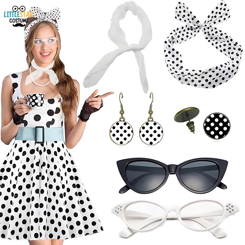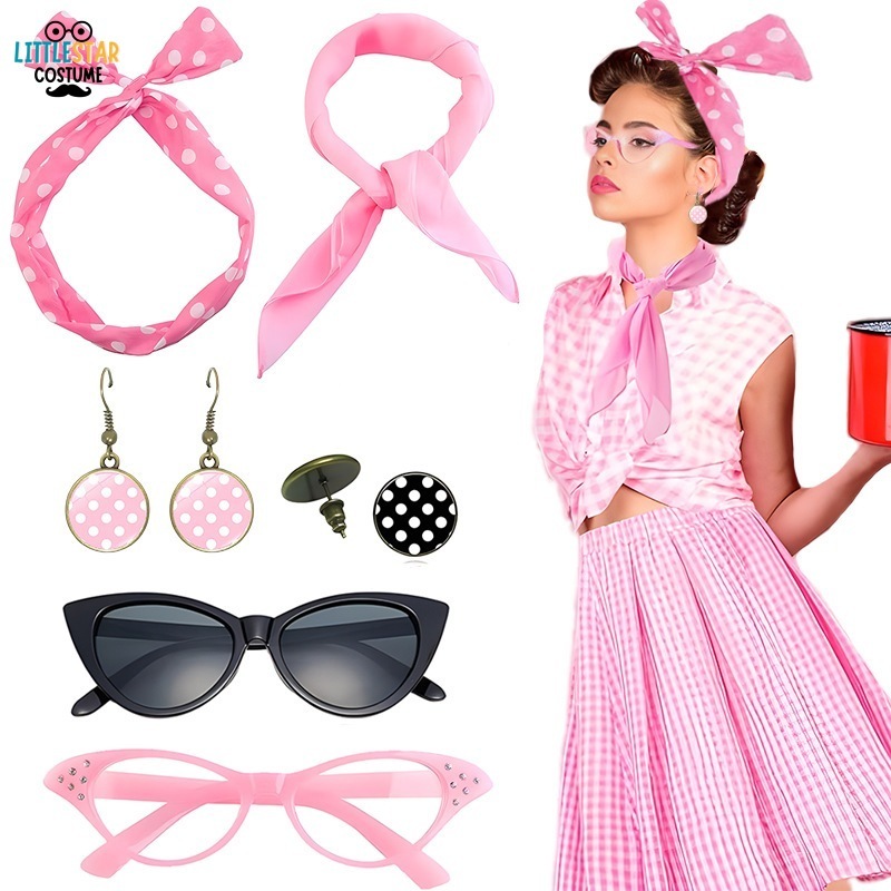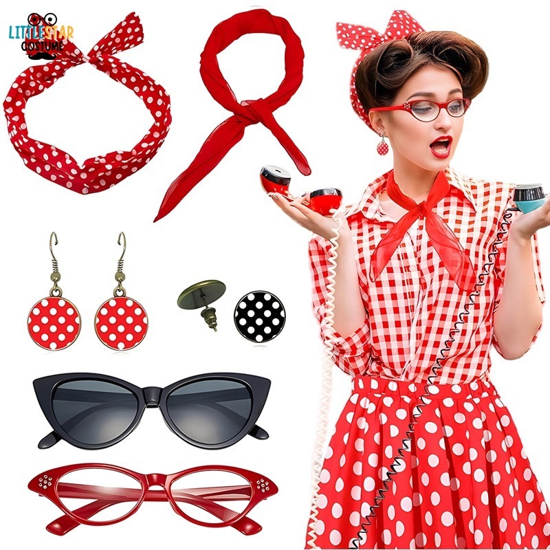 1950s Retro Women’s Accessory Set – Polka Dot Headband, Heart Glasses, Earrings & Scarf