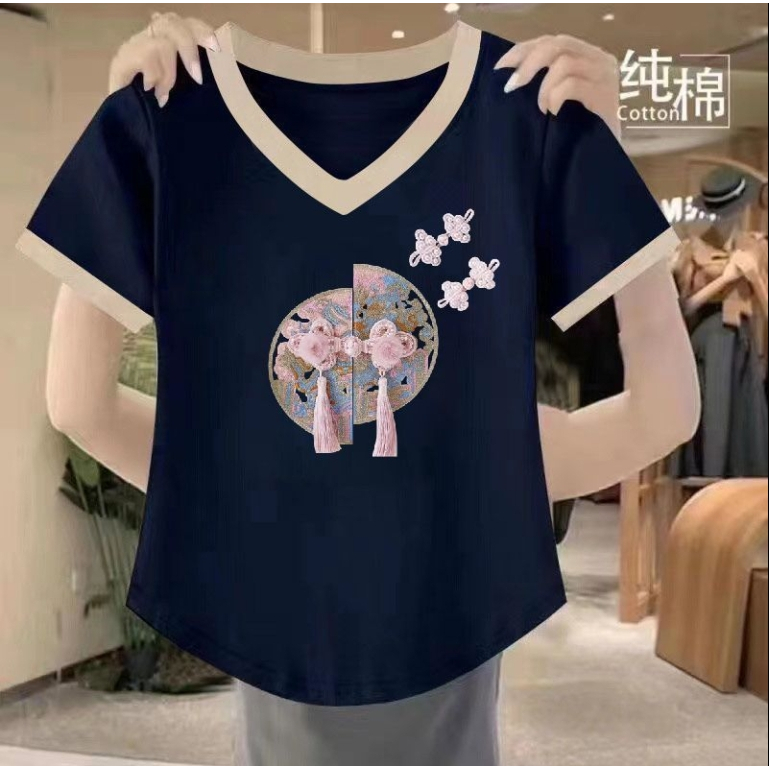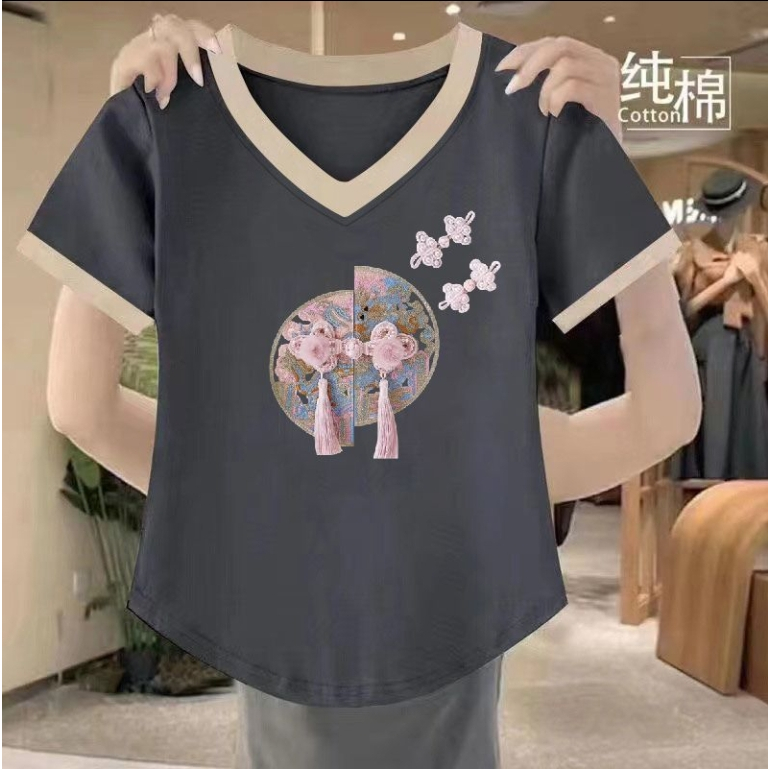 2024年印花新中式国风拼色短袖T恤女士新款夏季不规则遮肉上衣2024 Printing New Chinese Style Chinese Style Color Block Short20240622