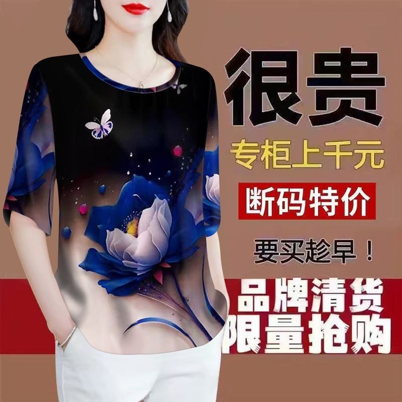清仓捡漏~专柜剪标七分袖2024新款韩版印花遮肚仿桑蚕丝T恤女上衣Clearing Warehouse and Picking up Leaks~Special Counter Cutting Label Seven Quarter Sleeve 20220240524