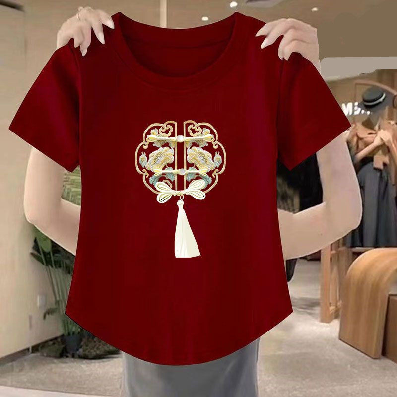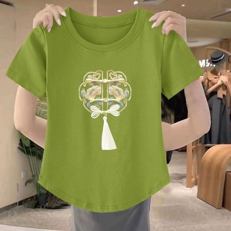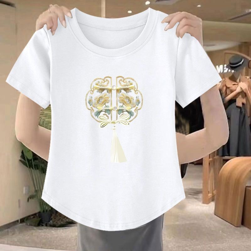 新中式 国风新款 2024夏季 印花短袖 T恤女 New Chinese style national style 2024 summer printed short sleeved T-shirt for women修身圆领不规则上衣女新中式国风新款2024夏季印花短袖T恤女修身圆领不规则上衣女 2024.4.10
