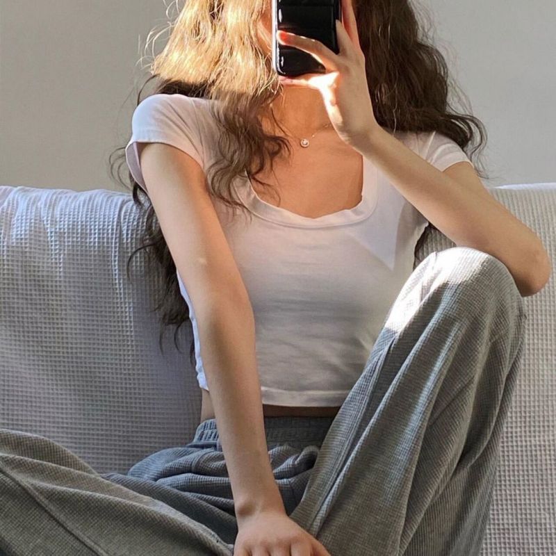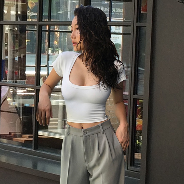 2024 Y2k Summer Slim U-neck T-shirt Sexy Women Short Sleeve Gray Tee Female Solid Black/White Korean Crop Tops