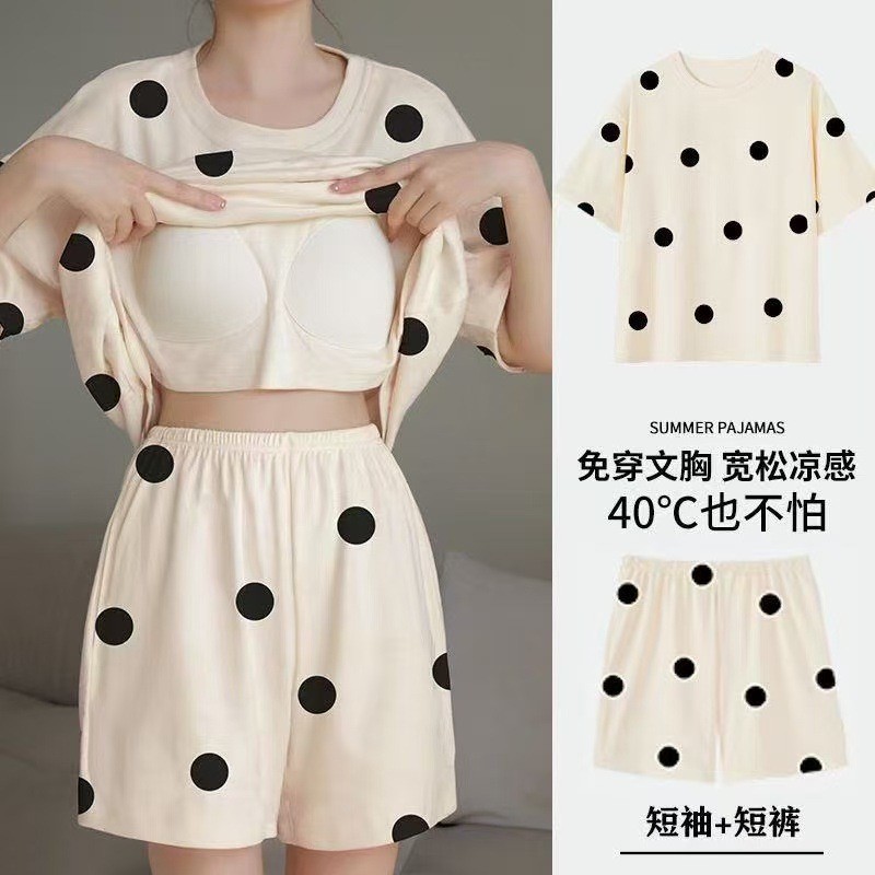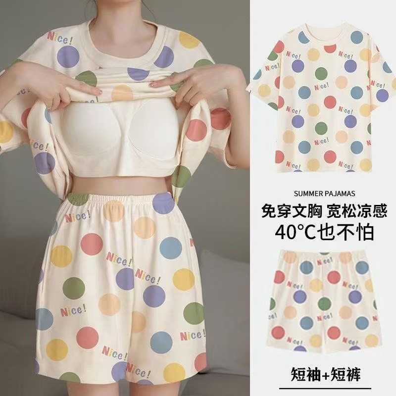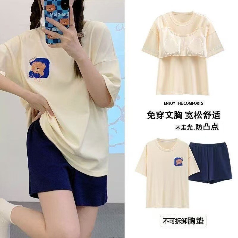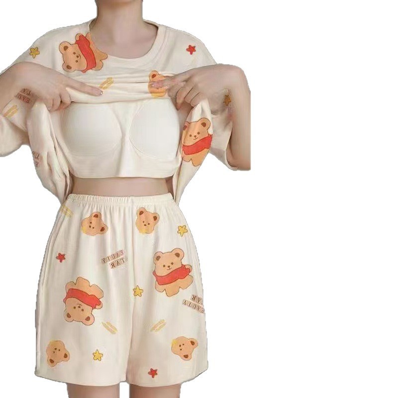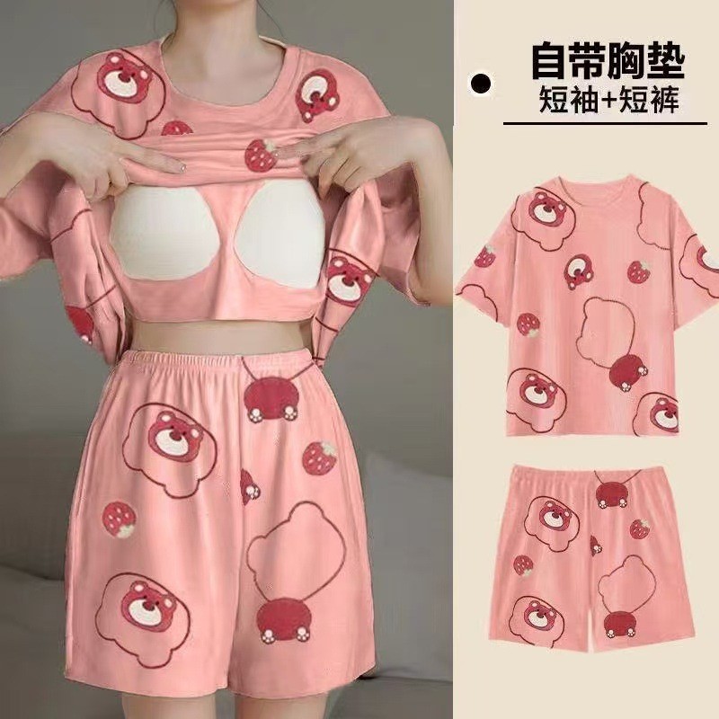 2025年短袖睡衣女夏季薄款带胸垫卡通少女学生圆领夏天家居服跨境Short Sleeve Lightweight Pajamas for Women - Cartoon-Themed, Student-Friendly Round Neck Design