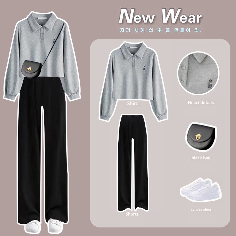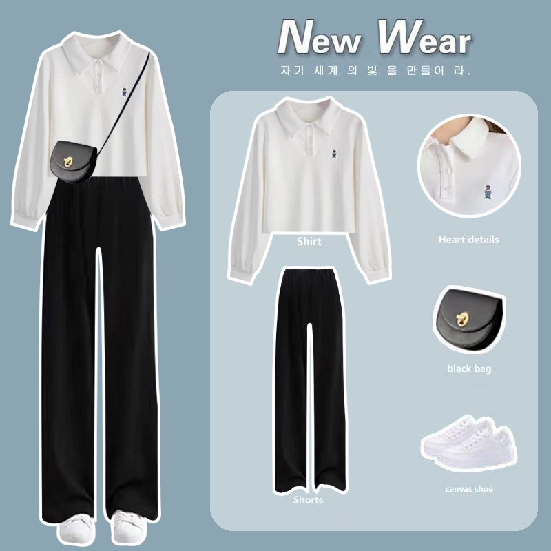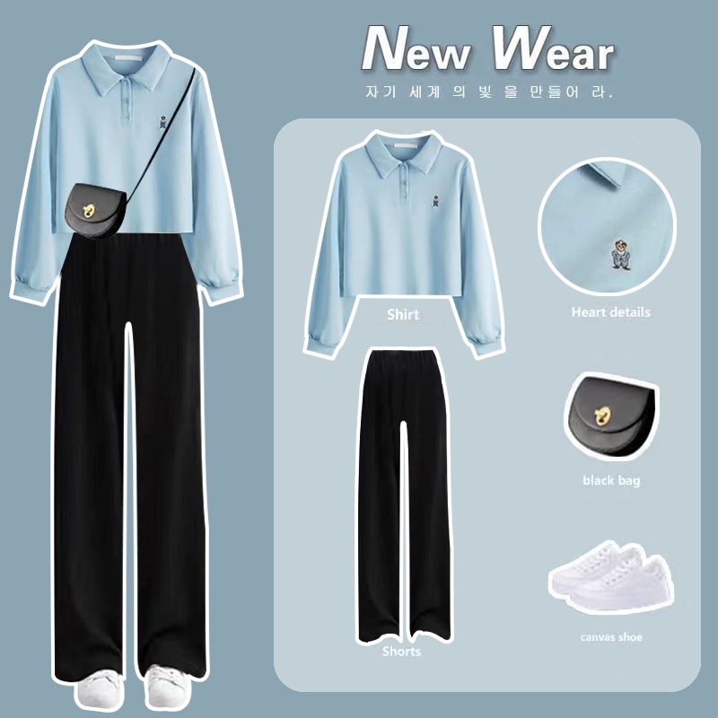 2PCS/Single Females Students Loose Blouse Short Crop Top Square Collar Wide Legged Pants Elastic Waist One Set Outfit Women Korean Style
