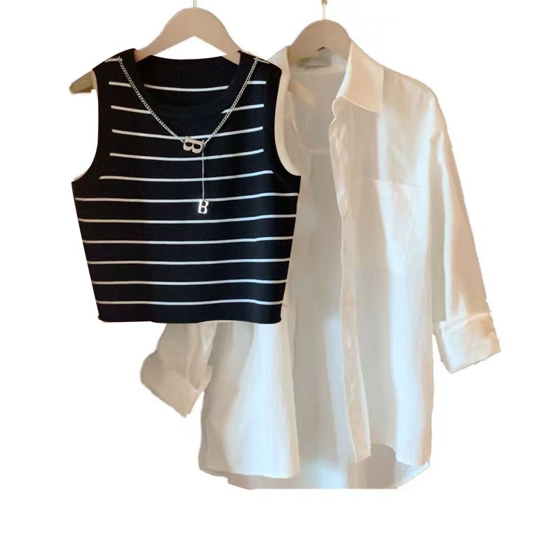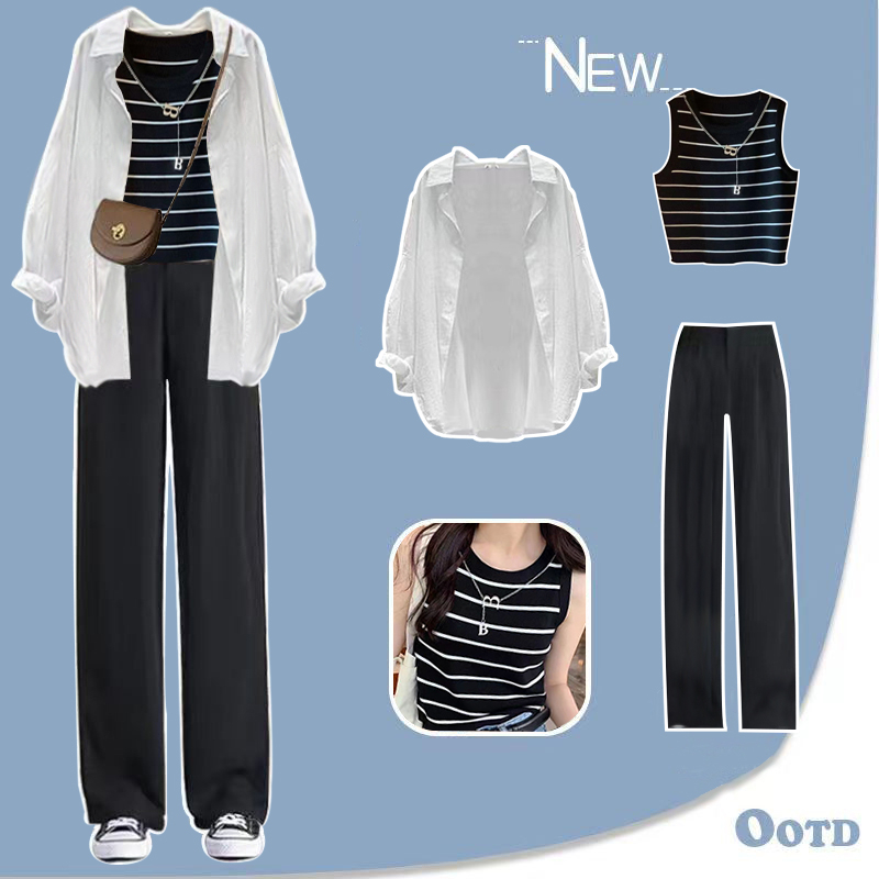 3PCS / Single Women's Summer Suit Korean Style Outfits New Flesh Covering Slimming Vest Loose Shirt High Waist Casual Pants Large Size Shirt Women New Fashion Baju Wanita Fesyen Baru