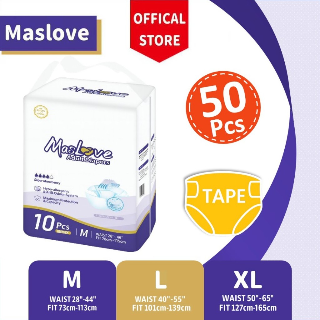 50 Pcs MasLove Adult Diapers Adult Tape/Pants Diapers S/M/L/XL/XXL (10Pcs/1Pack) Super Comfy Super Absorbency Leak-Proof