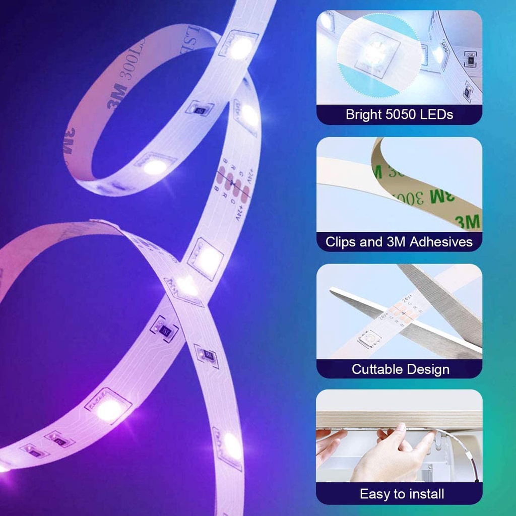 5M USB 5050 RGB LED Strip Lights with Music Sync, Remote, and App for TV and Bedroom Lighting.
