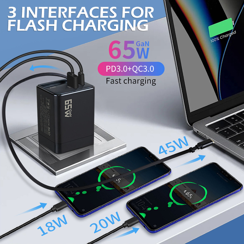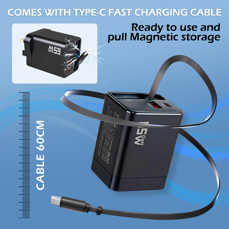 65W GaN Supert Charging Charger 3-in-1 With Built-in Retractable Cable +Type-C + USB A Port Foldable Charger