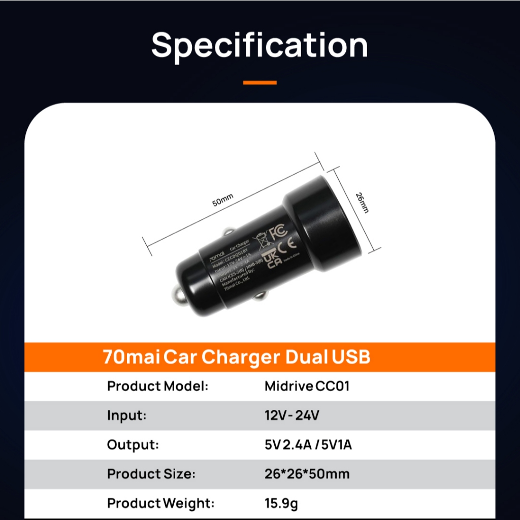 70mai Dual USB Car Charger CC01