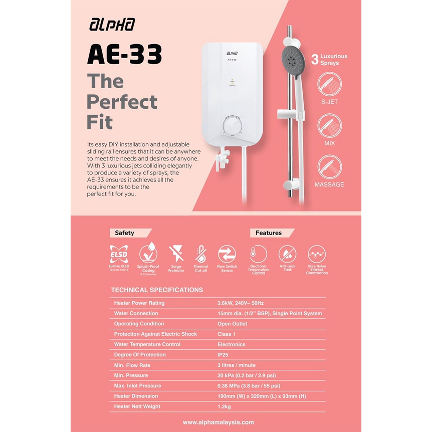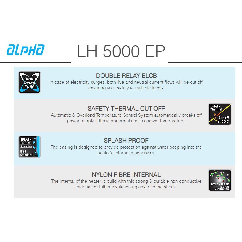 Alpha Shower Water Heater with Booster Turbo PUMP LH-5000EP SIRIM Approve LH5000EP / LH 5000EP / AE-33 / AE 33