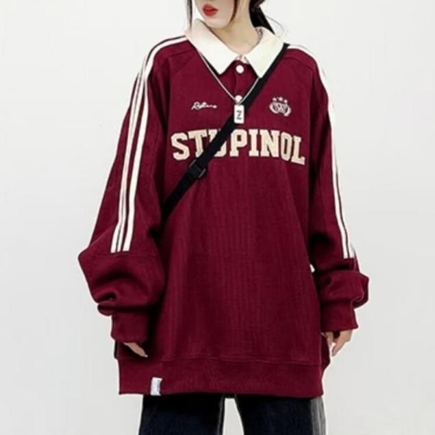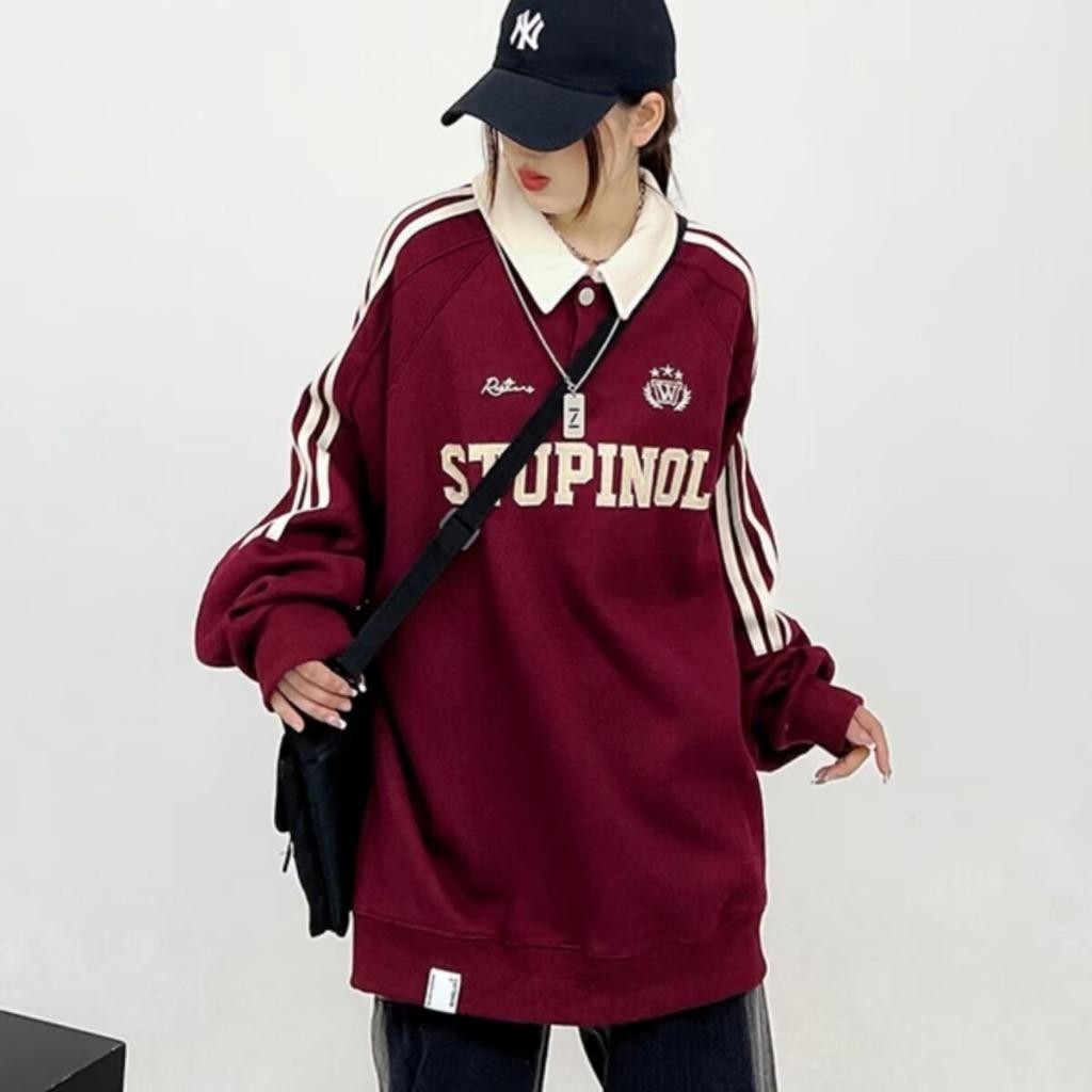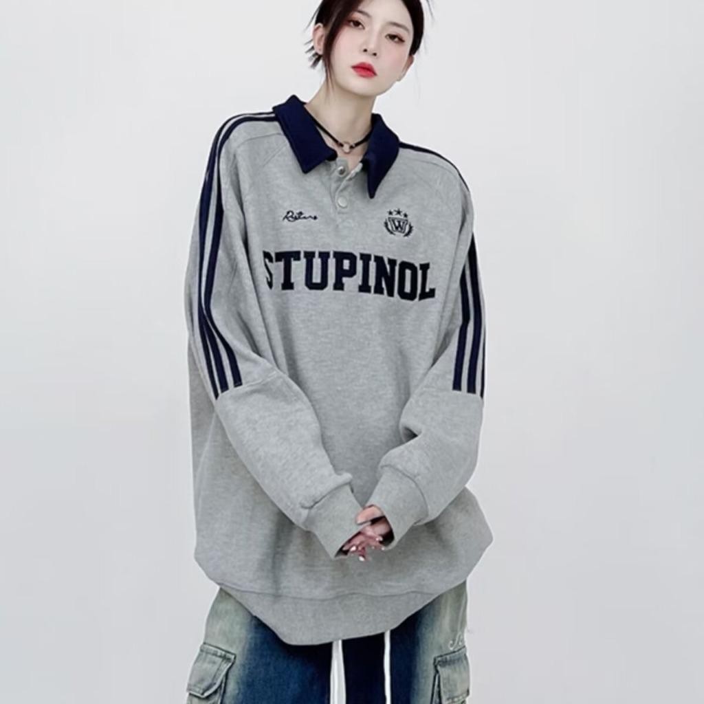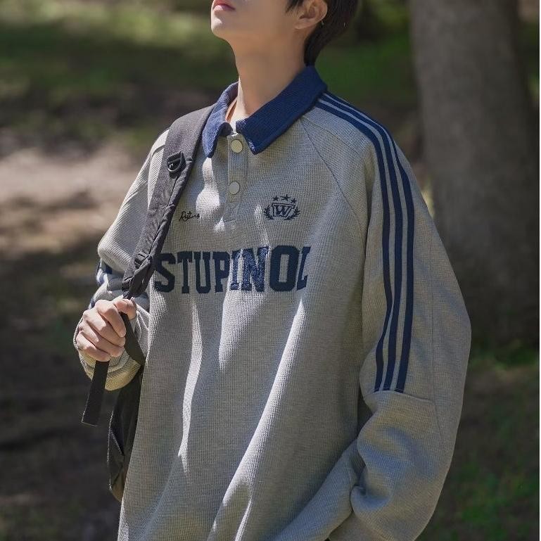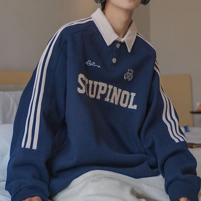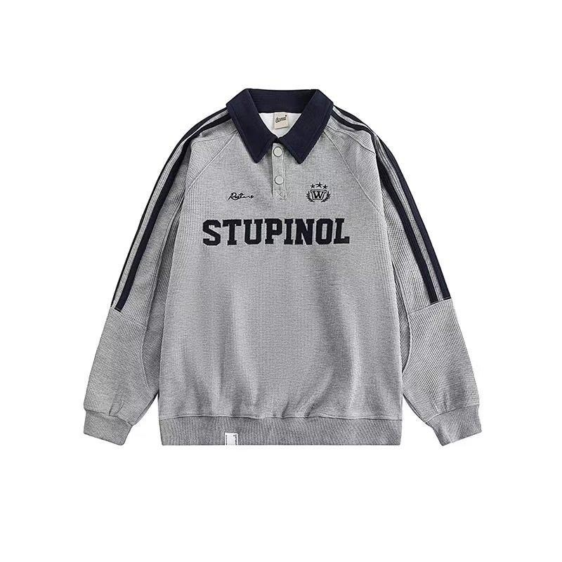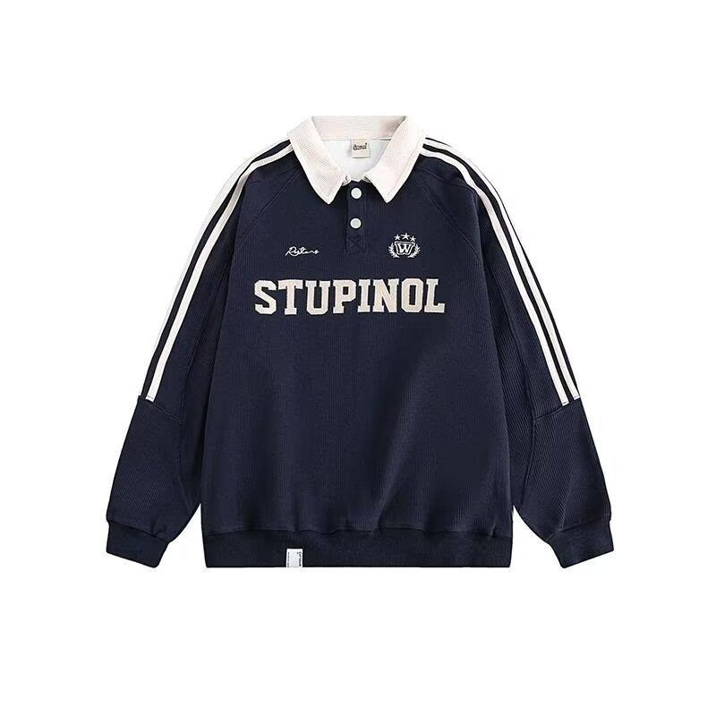 American retro long-sleeved sweatshirt for men, street style Polo sweatshirt for men and women, couples with letter embroidery and striped lapel pullover sweatshirt for men