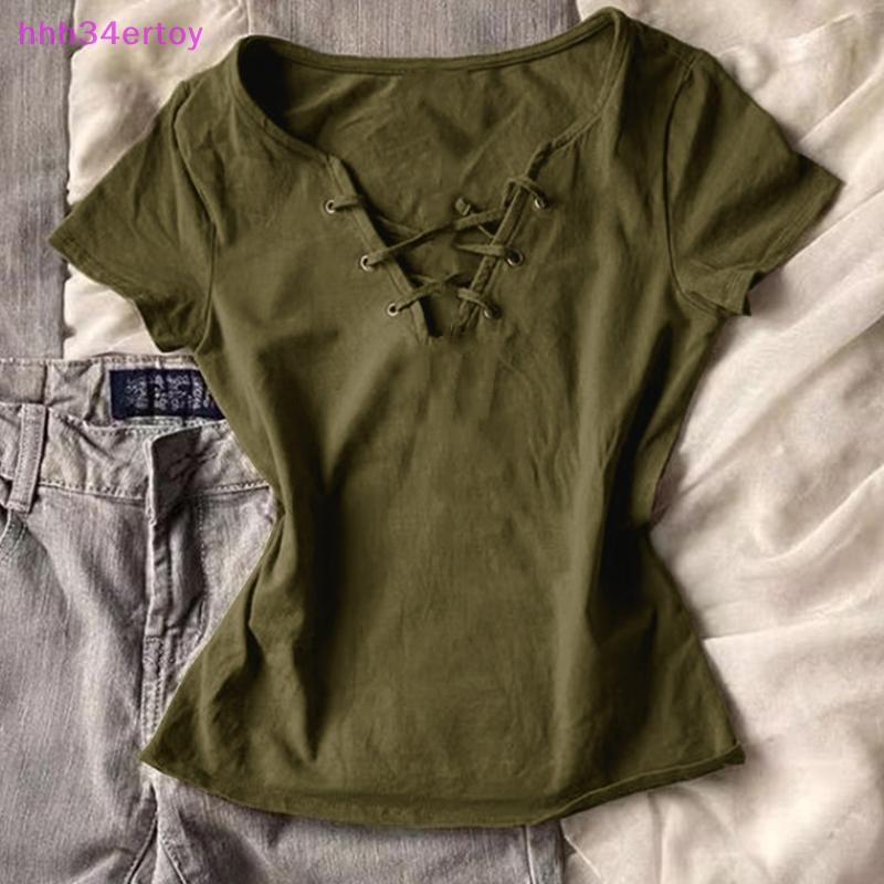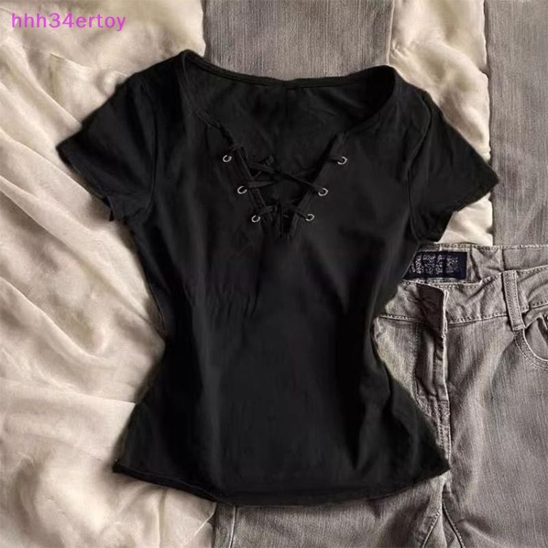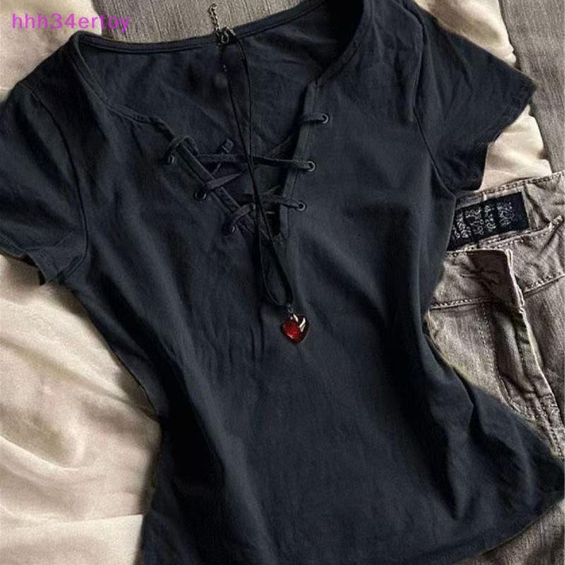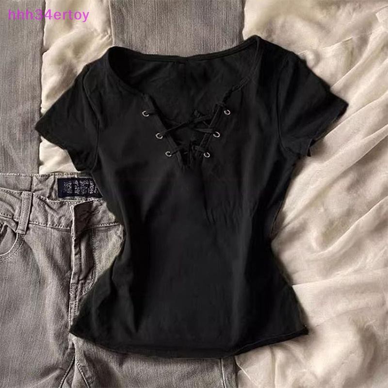 American V-neck Lace-up T-shirt - Fashionable Y2K Design for Women