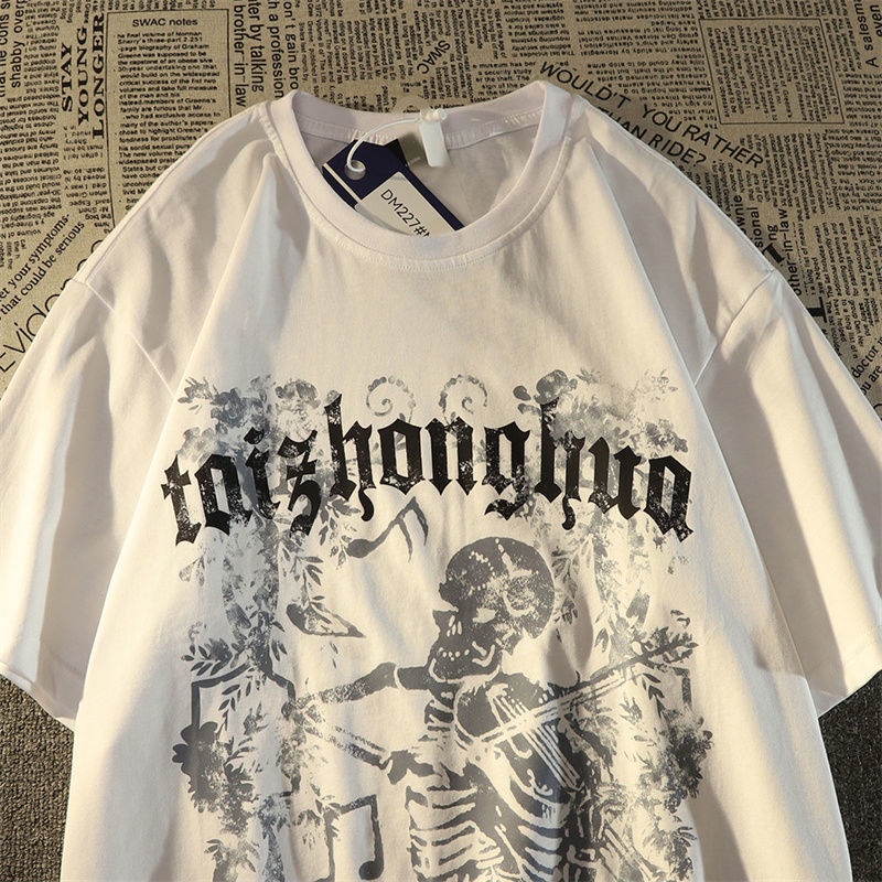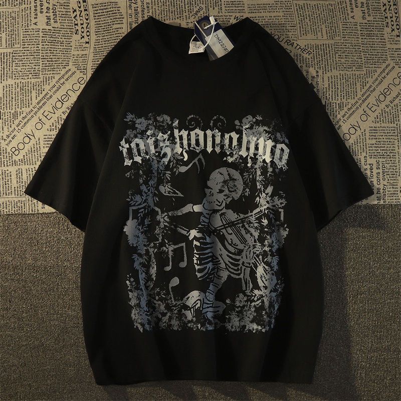 American Vintage High Street Dark Skull Violin Print Fashion Brand Short Sleeve T-shirt Men's Large Couple Unisex Shirt Top