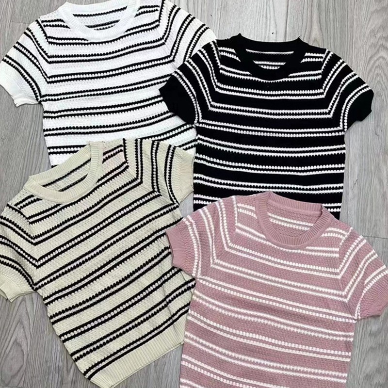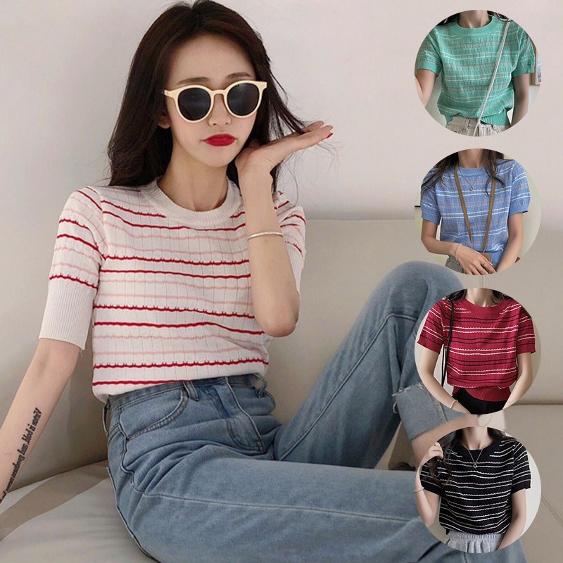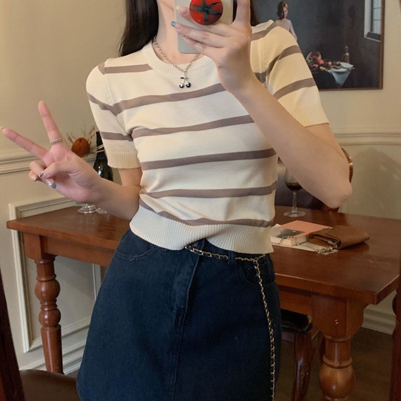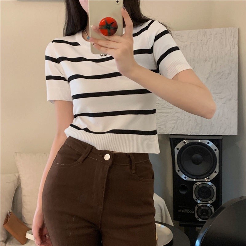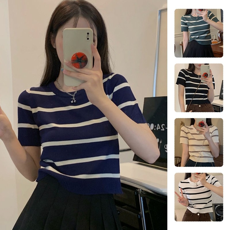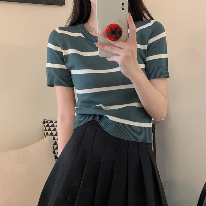 Amika1 Women's Short Sleeve T-shirt Female Korean Knitwear Knitted Round Neck Summer Stripe Tshirt Women Clothes
