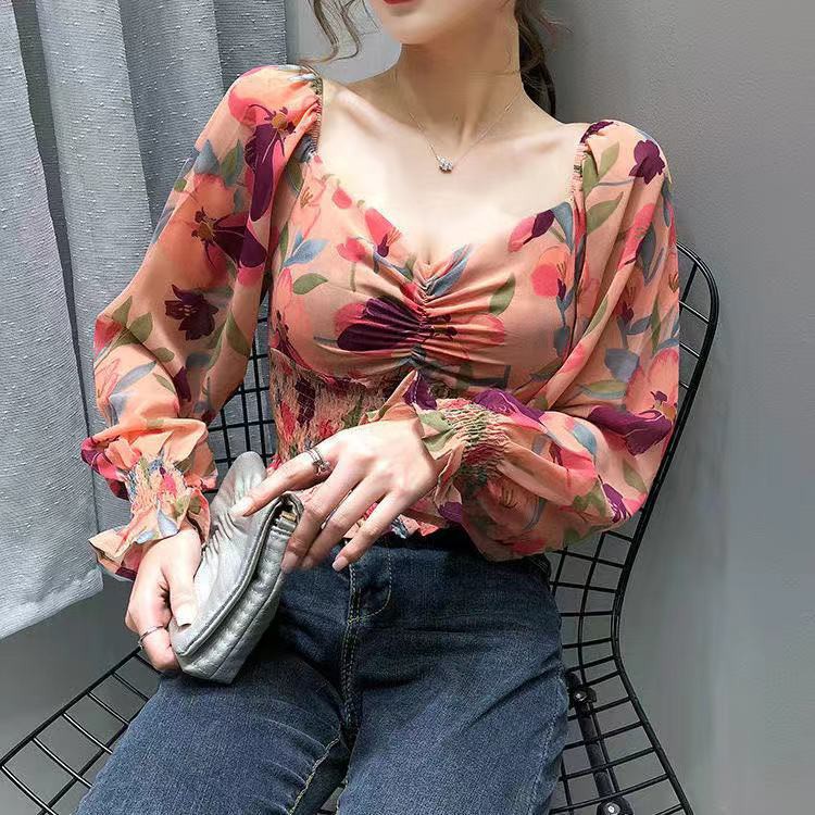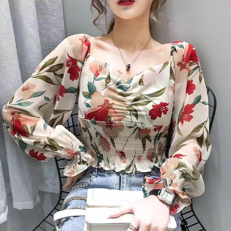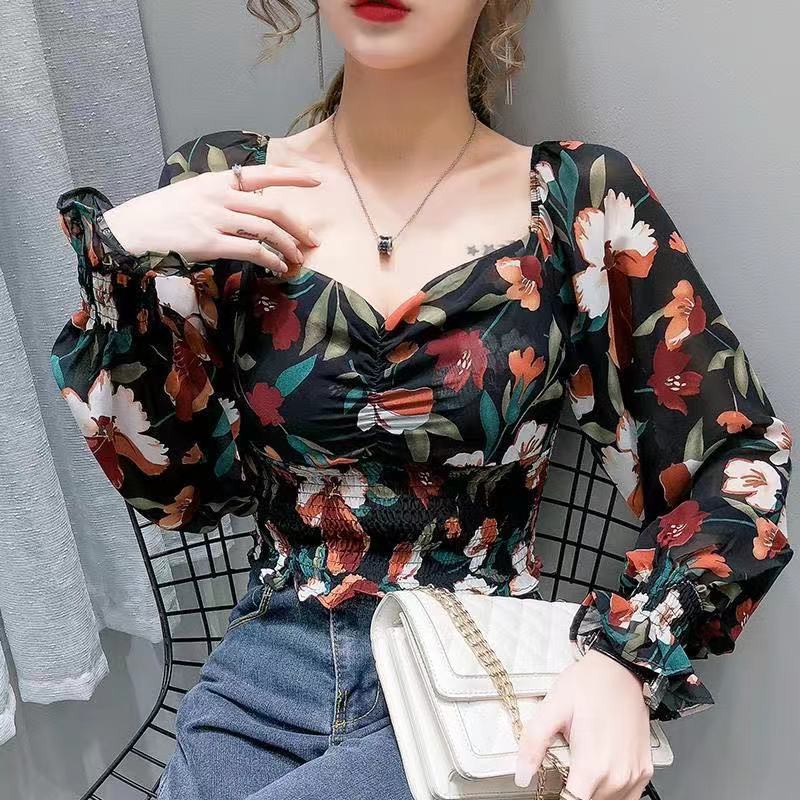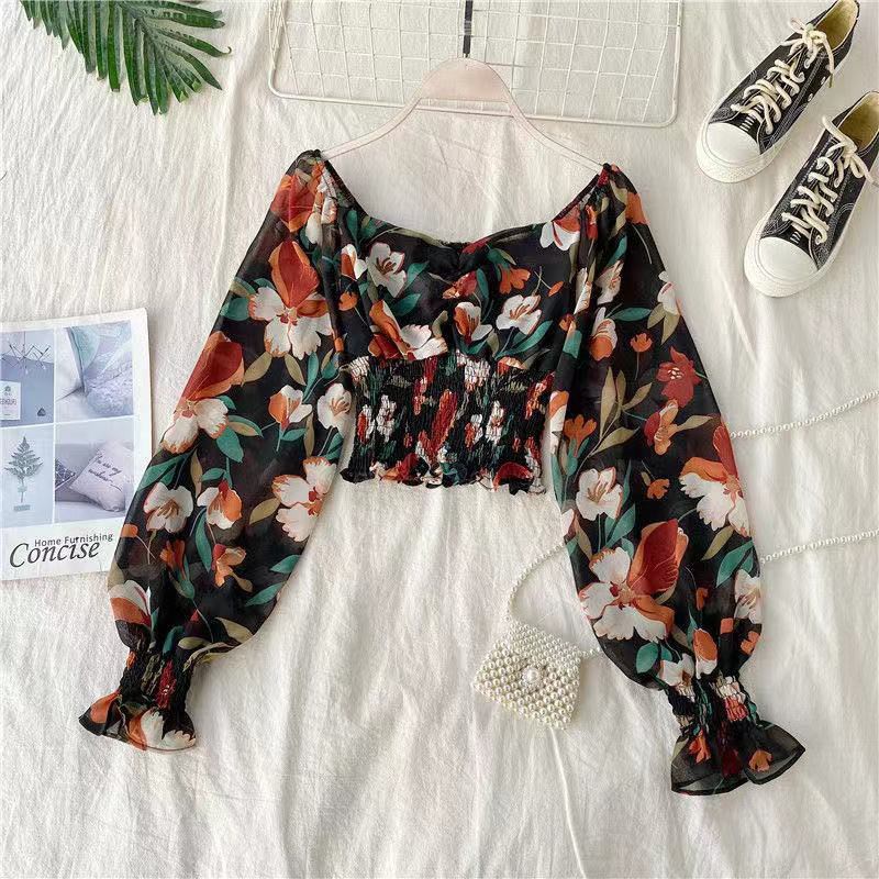 【AVA & Ready Stock】Women's Floral Fashion Puff Sleeve Square Neck Printed Chiffon Crop Top