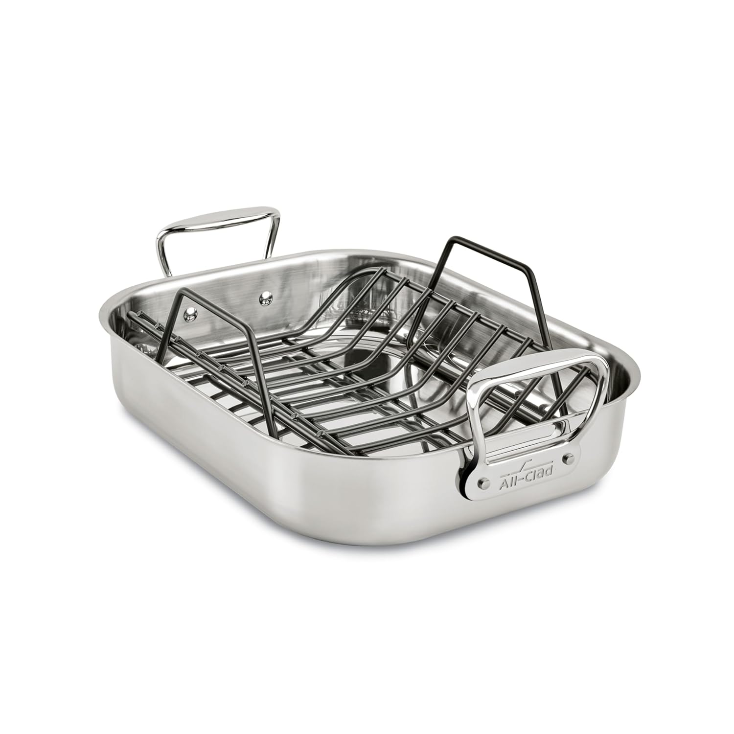 {"about_product": ["11-by-14-inch roasting pan with a removable V-shaped nonstick roasting rack", "Single-ply polished stainless-steel construction with warp-resistant bonded base", "Highly polished 18/10 stainless-steel cooking surface offers superior stick resistance and easy maintenance, plus won’t react with food", "More durable than traditional pans for a lifetime of use; stainless-steel handles permanently secured with stainless-steel rivets", "Oven and broiler safe up to 600°F, and compatible with gas, electric, and ceramic cooktops (not induction compatible).", "Highly Versatile: Rack is removable so that pan also doubles as a convenient baking dish. Racks are oven safe up to 375°.", "Dishwasher-safe; Limited Lifetime Warranty"], "product_description": "Roast meat, poultry, and vegetables to perfection with this versatile All-Clad E752S264 Gourmet Accessories small roaster. Holding up to a 15-lb. turkey, the heavy-duty stainless-steel roasting pan features tall, straight sides, which help prevent splatters and spills, while its upright handles ensure a secure hold when transporting the pan to and from the oven, even when wearing thick oven mitts. The roaster comes with a V-shaped nonstick roasting rack that elevates large cuts of meat to promote even heating, plus makes it easy to collect natural juices from the base of the pan for basting, glazing, or making gravy. Combining high-quality craftsmanship and long-lasting performance, All-Clad’s Gourmet Accessories cookware offers a sleek polished exterior, warp-resistant strength, compatibility with all stovetops (except induction), and dishwasher-safe cleanup—perfect for everyday cooking and holiday entertaining alike.", "product_information": {"ASIN": "B00008UA7C", "Manufacturer": "Groupe SEB", "Customer Reviews": "4.6 4.6 out of 5 stars \n\n (170)", "Best Sellers Rank": "#37,053 in Kitchen & Dining (See Top 100 in Kitchen & Dining) #64 in Roasting Pans", "Item model number": "11644910075", "Product Dimensions": "16.4 x 12.6 x 5.1 inches; 6 Pounds", "Date First Available": "May 5, 2003", "Is Discontinued By Manufacturer": "No"}, "product_details": {"Color": "Stainless-Steel", "Capacity": "15 Pounds", "Material": "Stainless Steel", "Finish Type": "non-stick", "Item Weight": "6 Pounds"}}