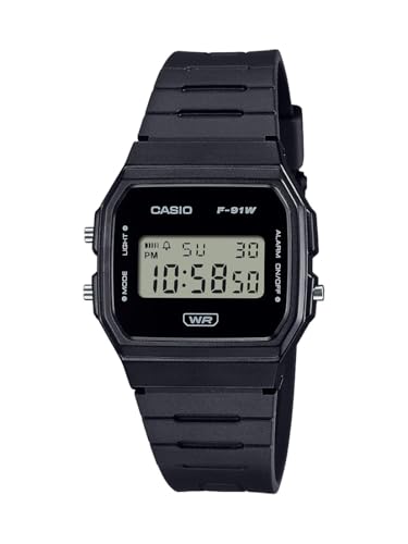 {"about_product": ["LED light, Stopwatch, Daily Alarm", "Auto-calendar, 12/24 Hour Format", "Approx. battery life: 7 years on CR2016", "Water Resistant - Do not submerge in water, item is not waterproof, not meant for showering/bathing or swimming"], "product_description": "", "product_information": {"ASIN": "B000GAWSDG", "Batteries": "1 Lithium Metal batteries required. (included)", "Department": "Unisex", "Manufacturer": "CASIO", "Customer Reviews": "4.6 4.6 out of 5 stars \n\n (56,739)", "Best Sellers Rank": "#669 in Clothing, Shoes & Jewelry (See Top 100 in Clothing, Shoes & Jewelry) #1 in Men's Wrist Watches", "Item model number": "F-91W-1X", "Product Dimensions": "3.54 x 13.39 x 15.35 inches; 1.9 ounces", "Date First Available": "November 12, 2003", "Is Discontinued By Manufacturer": "No"}, "product_details": {"Material": "Resin"}}