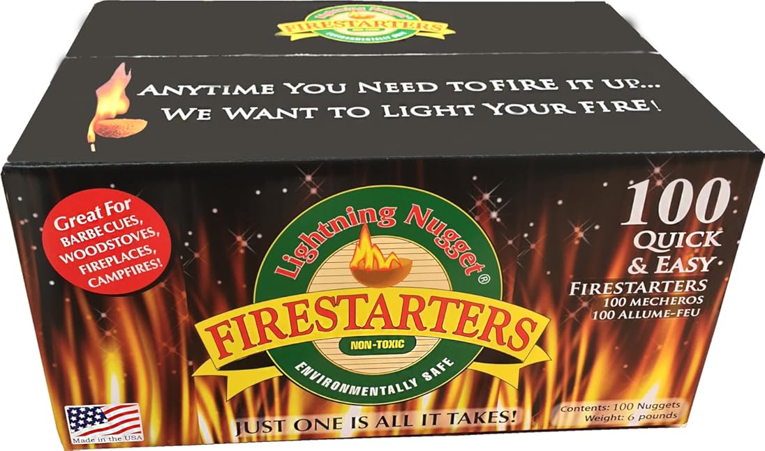 {"about_product": ["Food grade Firestarter", "Guaranteed to burn for 15 minutes per Nugget", "Great for: wood stoves, fire pits, barbecues, chimineas, campfires, pizza ovens Only 1 needed; no need for newspaper and kindling or messy lighter fluids or gels"], "product_description": "Lightning Nuggets fire starter, 100 Count, food grade-plant based- tinder for all fuels (firewood, lump charcoal, fire logs, briquettes). #1 replacement to lighter fluid.", "product_information": {"UPC": "885218088329 885338801181 885306098698 047815001006 885462255126 885520094339 885845329710 885691974775 802326205677 885893419906 885705124769 885796958229 885237822751", "ASIN": "B000KC009Y", "Item Weight": "6 pounds", "Manufacturer": "Lightning Nuggets", "Best Sellers Rank": "#1,455 in Sports & Outdoors (See Top 100 in Sports & Outdoors) #6 in Fire Starters", "Item model number": "N100SEB", "Product Dimensions": "2 x 2 x 1.25 inches", "Is Discontinued By Manufacturer": "No", "Global Trade Identification Number": "00047815001006"}, "product_details": {"Brand": "Lightning Nuggets", "Flavor": "Natural Wood", "Material": "Pine Wood, Wood", "Item Form": "Pellet", "Item Weight": "6 Pounds"}}