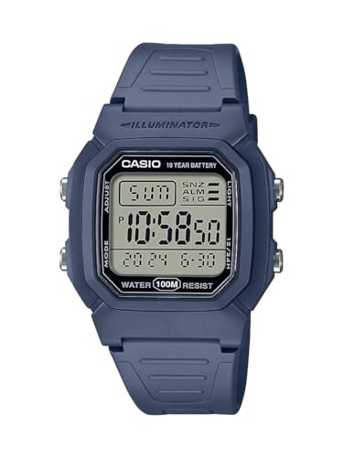 {"about_product": ["Impressive 10-Year Battery Life: Powered by a CR2025 battery, this watch delivers a decade of reliable performance, making it a low-maintenance timepiece for your daily life.", "100-Meter Water Resistance: Built to handle your adventures, this watch is suitable for swimming, snorkeling, and other water activities.", "Versatile Timekeeping Features: Includes dual time, 1/100-second stopwatch, and a 24-hour countdown timer, perfect for sports, travel, and daily routines.", "LED Backlight with Afterglow: The LED backlight ensures clear visibility in low-light conditions, making it easy to check the time day or night.", "Multi-Function Alarm & Auto Calendar: Stay organized with an hourly time signal, multi-function alarm (including a snooze option), and a full auto-calendar preprogrammed until 2099."], "product_description": "", "product_information": {"ASIN": "B001AWZDA4", "Batteries": "1 Lithium Metal batteries required. (included)", "Department": "unisex-adult", "Manufacturer": "Casio", "Customer Reviews": "4.6 4.6 out of 5 stars \n\n (24,720)", "Product Warranty": "For warranty information about this product, please click here. [PDF ]", "Best Sellers Rank": "#13,797 in Clothing, Shoes & Jewelry (See Top 100 in Clothing, Shoes & Jewelry) #47 in Men's Wrist Watches #124 in Women's Wrist Watches #339 in Men's Sunglasses & Eyewear Accessories", "Item model number": "W-800H-1AVCF", "Product Dimensions": "5 x 5 x 0.7 inches; 1.2 ounces", "Date First Available": "November 12, 2003", "Is Discontinued By Manufacturer": "No"}, "product_details": {"Material": "Resin"}}