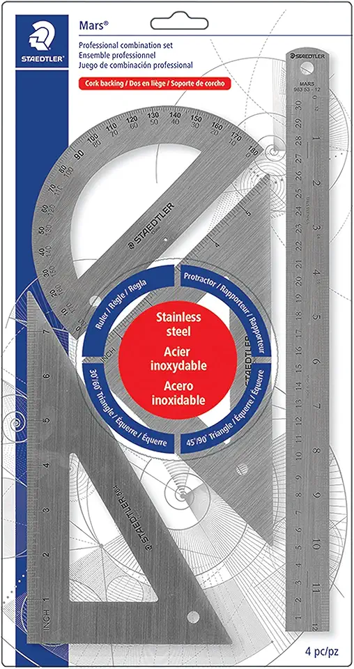 STAEDTLER Stainless Steel Math Set - With 12in Ruler, 2 Triangle Set Squares (45/90° & 30/60°), 6in Protractor - Precision Drawing & Drafting