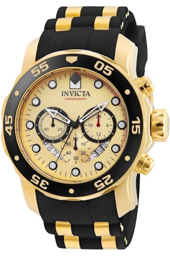 {"about_product": ["Stainless steel case 48mm diameter x 16.8mm thick; Black dial; Luminous hands and hour markers", "Japanese quartz movement, VD53 Caliber; Assembled in Japan; SR920SW battery included; Watch weight: 185 grams", "Stainless steel and black silicone band, 220mm L x 26mm W; Buckle clasp", "Flame Fusion crystal; Push/pull crown; Uni-directional stainless steel bezel with black top bezel ring; Functional Subdials: 60min, 60sec, 24hr; 100 meter water resistant: Suitable for recreational surfing, swimming, snorkeling, sailing and water sports. Not suitable for diving.", "Function meets fashion in this Invicta watch, which features sophisticated design details such as a rotating date calendar and black sunray dial with silver-tone hands and markers.", "Protective mineral crystal dial window"], "product_description": "", "product_information": {"ASIN": "B003MYUQKA", "Batteries": "1 CR2 batteries required. (included)", "Department": "mens", "Manufacturer": "Invicta", "Customer Reviews": "4.7 4.7 out of 5 stars \n\n (15,315)", "Product Warranty": "For warranty information about this product, please click here", "Best Sellers Rank": "#27,147 in Clothing, Shoes & Jewelry (See Top 100 in Clothing, Shoes & Jewelry) #96 in Men's Wrist Watches", "Item model number": "6977", "Product Dimensions": "0.59 x 0.59 x 0.59 inches; 8.82 ounces", "Date First Available": "May 17, 2010", "Is Discontinued By Manufacturer": "No"}, "product_details": {"Material": "Polyurethane"}}