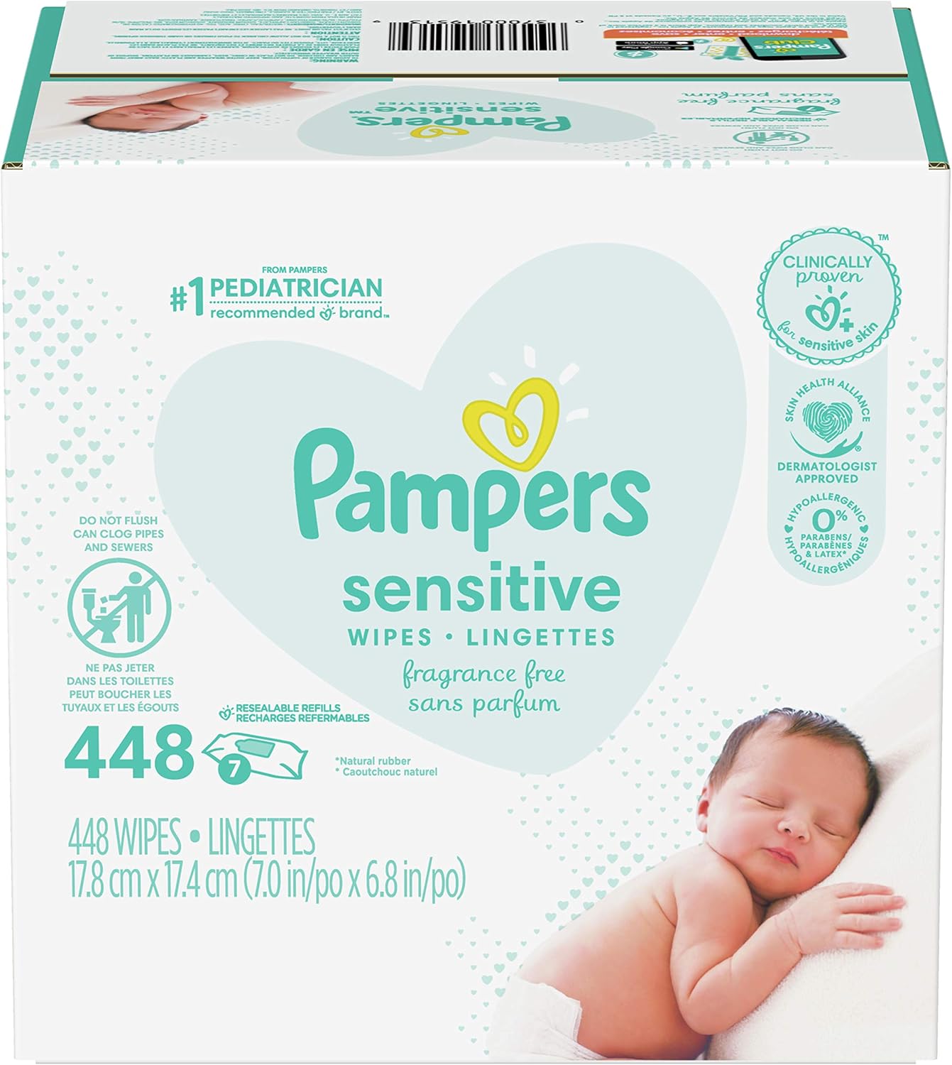 {"about_product": ["Clinically Proven: Pampers Sensitive wipes are clinically proven for sensitive skin", "Thick and soft: Gently cares for your baby’s delicate skin", "Skin-Friendly: Gentle and hypoallergenic— 0% alcohol, fragrance, parabens and latex* (*No rubbing alcohol and no natural rubber latex)", "1-Wipe Pop-Top: Dispenses one wipe at a time so you only get what you need", "Trustworthy: From Pampers, the #1 pediatrician recommended brand"], "product_description": "Product Description Clinically proven to protect your little one’s sensitive skin, Pampers Sensitive baby wipes are thick and soft for a gentle clean. Pampers Sensitive baby wipes are the #1 choice of hospitals** and are Skin Health Alliance Dermatologist approved. They are milder than a washcloth and water and help maintain skin’s natural pH. Pampers Sensitive baby wipes are hypoallergenic and free of alcohol, fragrance, parabens, and latex.* Plus, our convenient 1-Wipe pop-top is designed to dispense one wipe at a time, so you only get what you need to tackle the mess at-hand. From Pampers, the #1 pediatrician recommended brand. For healthy skin, use Pampers Sensitive wipes together with Pampers Swaddlers diapers . *No rubbing alcohol and no natural rubber latex **based on hospital sales data Brand Story By Pampers", "product_information": {"ASIN": "B005DLCJX2", "Manufacturer": "Pampers", "Customer Reviews": "4.8 4.8 out of 5 stars \n\n (17,520)", "Best Sellers Rank": "#9,607 in Baby (See Top 100 in Baby) #84 in Diaper Wipes & Refills", "Item model number": "-5636", "Product Dimensions": "9.33 x 7.95 x 9.45 inches; 1 Pounds", "Date First Available": "April 1, 2012", "Manufacturer recommended age": "6 months - 3 years", "Is Discontinued By Manufacturer": "No"}, "product_details": {"Brand": "Pampers", "Skin Type": "Sensitive", "Unit Count": "448 Count", "Number of Items": "1", "Material Feature": "Natural"}}