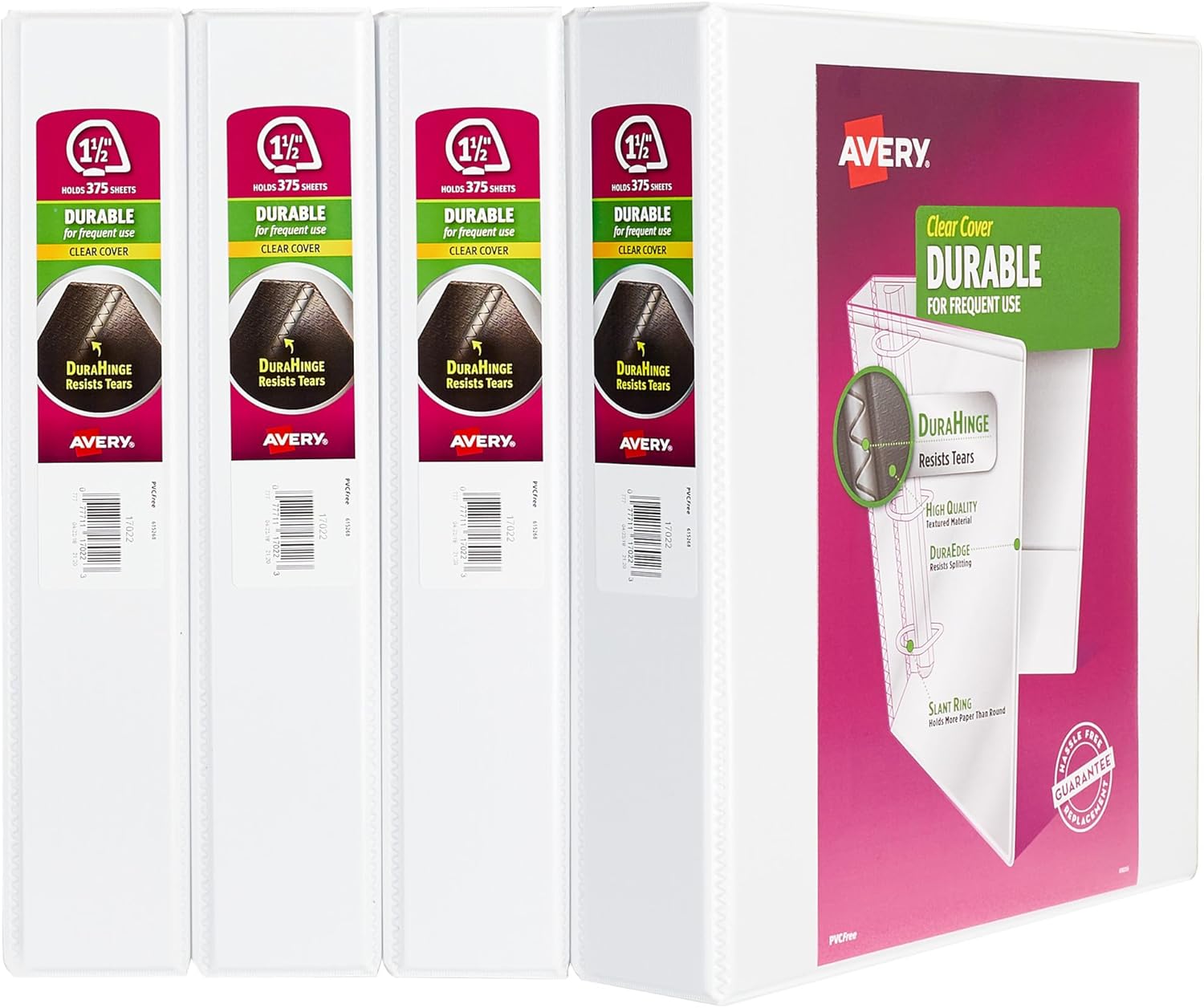 {"about_product": ["Durable And Protective Design: The 3 ring binders have a 1.5 inch ring size, a tear-resistant DuraHinge spine, and flexible DuraEdge edges", "Ample Storage Capacity: The binders hold 375 sheets each, ideal for organizing school binder supplies, office binder supplies, or personal documents", "Customizable For Personalization: Easily identify and personalize your 1 1/2 inch binders with the customizable spine, front, and back cover", "Flat Storage For Documents: Keep important papers organized in the 3 ring binder 1.5 inch with the rear-mounted slant rings", "Additional Storage Pockets: Enjoy extra storage with two interior clear pockets for binders, made with nonstick PVC-free material, perfect for a binder with plastic pockets"], "product_description": "The Avery Durable View 3 Ring Binder is an essential for home organization, office needs, or school supplies. This set of 4 binders is great for those seeking binders capable of handling extensive paperwork. Each binder features 1.5-inch slant rings, accommodating up to 375 sheets, making them ideal for a variety of tasks, whether as a wedding planning book and organizer or a school organizer. The tear-resistant DuraHinge spine and DuraEdge split-resistant edges offer durability beyond standard three ring binders, delivering longevity and protection. Customizing these binders is a breeze with a clear view cover, allowing you to personalize the spine, front, and back cover for easy identification. For added convenience, each 1.5 inch binder includes two interior clear pockets made from nonstick PVC-free material, protecting your documents from ink smudges. Utilize the binder pockets and plastic pockets for paper 8.5x11 to keep your pages pristine and organized. Whether using them as a wedding binder or for storing important schoolwork, these Avery binders deliver versatility and strength. Ideal as a large 3 ring binder option for home, school, or office use, these binders are a great choice when you need reliable and stylish organization.", "product_information": {"ASIN": "B00IX1C8V2", "Size": "1.5\"", "Brand": "Avery", "Color": "White", "Shape": "Rectangular", "Sheet Size": "8 1/2 x 11", "Item Weight": "4.2 ounces", "Manufacturer": "Avery", "Material Type": "Paper", "Number of Holes": "3", "Number of Items": "1", "Best Sellers Rank": "#10,868 in Office Products (See Top 100 in Office Products) #12 in View Binders", "Item model number": "17576", "Number of Dividers": "4", "Product Dimensions": "1 x 1 x 1 inches", "Date First Available": "April 8, 2014", "Manufacturer Part Number": "17576"}, "product_details": {"Brand": "Avery", "Color": "White", "Capacity": "1.5 Inches", "Material": "Paper", "Sheet Size": "8 1/2 x 11"}}