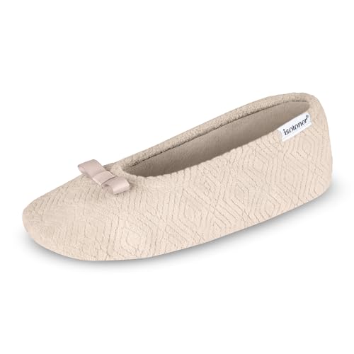 {"about_product": ["SIZE AND FIT: This style runs slightly small. For the best fit and all-day comfort, we recommend sizing up, especially if you are between sizes or prefer a little extra wiggle room.", "PLUSH COMFORT: Unwind in soft luxury with these ballerina slippers, crafted from rich micro terry cloth and detailed with an elegant chevron pattern. Designed for cozy, all-day wear—perfect for lounging, reading, or winding down in style.", "SECURE & SLIP RESISTANT: Designed with your safety in mind, these slippers stay comfortably in place while offering non-slip stability. Whether you’re tidying up or relaxing, you’ll move with ease and confidence around the house.", "TIMELESS SILHOUETTE: This ballerina silhouette paired with a dainty bow adds a graceful, elegant touch to your at-home wardrobe. Stylish enough to feel dressed up, comfy enough to wear from morning to night.", "EASY-CARE CONVENIENCE: Keep your slippers looking fresh—simply toss them in the wash for quick, effortless cleaning whenever needed. Machine wash cool; dry flat away from heat.", "BREATHABLE DESIGN: Stay dry and cozy with the moisture-wicking lining that keeps your feet fresh. Paired with a classic suede outsole, these slippers offer soft support and flexible comfort that moves with you."], "product_description": "Step into elegance with theDiamond Microterry Gemma Ballerina Slipper—your perfect companion for those small, graceful moments that make each day feel a little brighter. The sculpted diamond patterned microterry knit upper and PillowStep memory foam are as gentle and soft as a dancers movements. With a genuine suede, pig split indoor outsole and a timeless ballerina silhouette, the Gemma slippers are as seasonless as they are stylish. Whether you are sipping morning coffee or winding down after a long day, these slippers bring a little grace to every moment.", "product_information": {"ASIN": "B01IPEWPUU", "Department": "womens", "Manufacturer": "Isotoner", "Customer Reviews": "4.5 4.5 out of 5 stars \n\n (15,419)", "Best Sellers Rank": "#1,115 in Clothing, Shoes & Jewelry (See Top 100 in Clothing, Shoes & Jewelry) #53 in Women's Slippers", "Item model number": "96051", "Package Dimensions": "10 x 8.3 x 0.7 inches; 1.8 ounces", "Date First Available": "September 29, 2016"}, "product_details": {"Origin": "Imported", "Sole material": "Suede", "Inner material": "Moisture-wicking Fabric", "Outer material": "Synthetic"}}