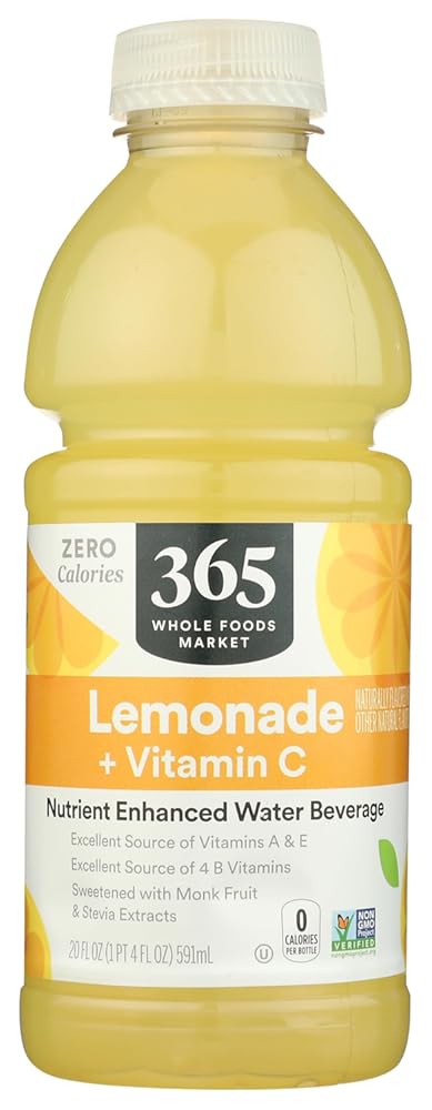 {"about_product": ["Zero-calorie lemonade flavored water with vitamin C", "Sweetened with monk fruit and stevia extracts", "Kosher certified", "Non-GMO verified", "Refreshing nutrient-enhanced beverage"], "product_description": "Who are we? Well, we seek out the finest natural and organic foods available, maintain the strictest quality standards in the industry, and have an unshakeable commitment to sustainable agriculture. We ban 300+ ingredients from all food that we sell, including hydrogenated fats, high-fructose corn syrup and sweeteners such as aspartame, sucralose and saccharin, so you can skip deciphering ingredient labels and cut to relishing your finds. Our 365 by Whole Foods Market brand offers over 2,500 affordably priced and thoughtfully sourced products that not only meet our already strict standards, but also in many cases go above and beyond what we require of other brands.", "product_information": {"UPC": "099482464950", "ASIN": "B074H7LFZD", "Units": "20 Fluid Ounces", "Manufacturer": "365 by Whole Foods Market", "Customer Reviews": "3.9 3.9 out of 5 stars \n\n (1,087)", "Best Sellers Rank": "#48,169 in Grocery & Gourmet Food (See Top 100 in Grocery & Gourmet Food) #46 in Lemonade", "Item model number": "0099482464950", "Product Dimensions": "2.92 x 2.92 x 7.79 inches; 1.25 Pounds"}, "product_details": {"Brand": "365 by Whole Foods Market", "Flavor": "Lemonade", "Specialty": "Kosher, Vegan", "Unit Count": "20 Fluid Ounces", "Number of Items": "1"}}