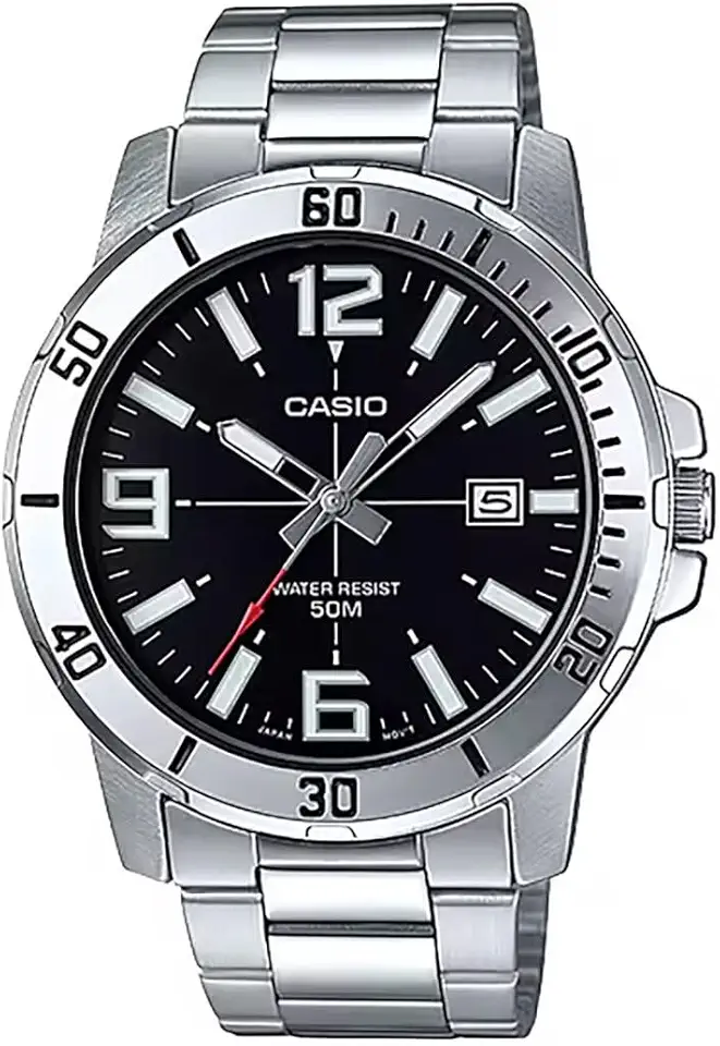 Casio MTP-VD01D-1BV Men's Enticer Stainless Steel Black Dial Casual Analog Sporty Watch, Silver, 48×42×10.7mm, Quartz Movement