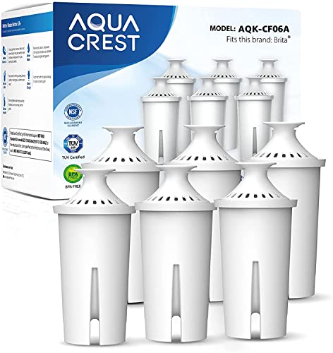 {"about_product": ["[NSF Certified] This pitcher water filter replacement has been certified against NSF/ANSI 42 for the reduction of chlorine. The material used to make the AQUA CREST filter meets NSF372 requirements for being free of lead.", "[High Flow Rate] The outstanding filtration property of this filter can ensure high and stable flow rate. Made from food-grade materials, this filter is BPA-free, ensuring every drop is pure and clean.", "[Compatible Model] This replacement for Brita water filter is suitable for all Brita pitchers and dispensers, including Grand, Lake, Capri, Wave, Metro, Amalfi, Soho, Infinity, Marina, Pacifica, Space Saver, Stainless Steel, Monterey, Altantis, and Ultramax. (Excluding Brita Stream, Hub Instant System & Bottle) The filter is also suitable for Great Value pitchers. The manufacturer’ s name and part number have been used for reference purposes only.", "[4-stage Filtration] This filter adopts a pre-filter layer with coconut shell activated carbon and high-quality ion-exchange resin to ensure the maximum filtration and clean water possible. Tested by a third-party lab, it can efficiently reduce chlorine, rust, taste and odor, and sediments.This filter DOES NOT lower TDS value.", "[Long Lifespan] Tested by NSF/ANSI 42 Standard, this pitcher water filter replacement has optimal performance and a long lifespan for up to 40 gallons (Based on NSF Certified), which may vary based on local water conditions. It will provide you with great-tasting purified water and reduce plastic waste."], "product_description": null, "product_information": {"UPC": "840814152386 840814155721 840814171011 840814171035", "ASIN": "B07G7BT8QV", "Size": "6 Count", "Brand": "AQUA CREST", "Color": "White", "Style": "Classic", "Material": "Lead-Free & Food-Grade Material, (NSF Certified) Activated Carbon & Resin", "Set Name": "Classic", "Unit Count": "6.0 Count", "Item Weight": "1.23 pounds", "Part Number": "AQK-06-6", "Manufacturer": "AQUA CREST", "Number of Items": "6", "Number Of Pieces": "6", "Product Benefits": "Reduces Chlorine", "Best Sellers Rank": "#230 in Tools & Home Improvement (See Top 100 in Tools & Home Improvement) #7 in Replacement Pitcher Water Filters", "Item model number": "AQK-CF06A", "Product Dimensions": "6.85\"D x 4.84\"W x 5.12\"H", "Batteries Included?": "No", "Batteries Required?": "No", "Included Components": "Pitcher Filter Replacement *6,User's Manual *1", "Date First Available": "August 6, 2018", "Item Package Quantity": "1", "External Testing Certification": "NSF42&372 Certification, ANSI42$372 Certification", "Is Discontinued By Manufacturer": "No", "Compatible Water Purifier Models": "BRITA Amalfi Water Pitcher, BRITA Aqualux Water Pitcher, BRITA Atlantis Water Pitcher, BRITA Capri Water Pitcher, BRITA Champlain Water Pitcher, BRITA Chrome Water Filter Pitcher, BRITA Classic Water Pitcher, BRITA Color Series Water Pitcher, BRITA Deluxe Water Pitcher, BRITA Denali Water Pitcher, BRITA Everyday Water Pitcher, BRITA Grand Water Pitcher, BRITA Huron Water Pitcher, BRITA Infinity Water Pitcher, BRITA Lake Water Pitcher, BRITA Marina Water Filtration Pitcher, BRITA Metro Water Pitcher, BRITA Mini Plus Water Pitcher, BRITA Monterey Water Pitcher, BRITA Pacifica Water Pitcher, BRITA Slim Water Filter Pitcher, BRITA Soho Water Pitcher, BRITA Space Saver Water Pitcher, BRITA Stainless Steel Water Pitcher, BRITA Tahoe Water Pitcher, BRITA Ultramax Water Dispenser, BRITA Wave Water Pitcher"}, "product_details": {"Material": "Lead-Free & Food-Grade Material, (NSF Certified) Activated Carbon & Resin", "Item Weight": "1.23 Pounds", "Product Benefits": "Reduces Chlorine", "Product Dimensions": "6.85"D x 4.84"W x 5.12"H", "External Testing Certification": "NSF42&372 Certification, ANSI42$372 Certification"}}