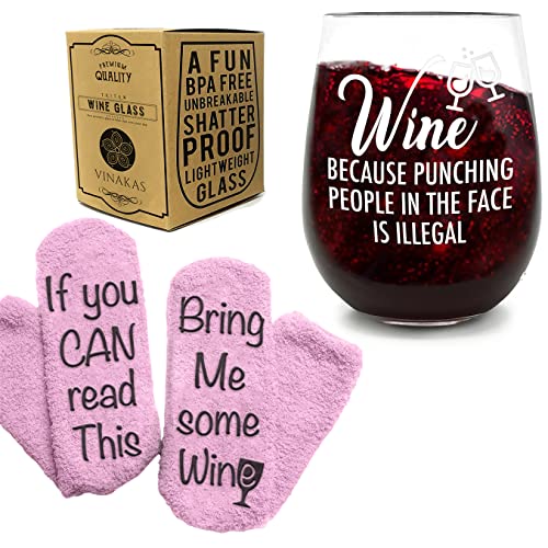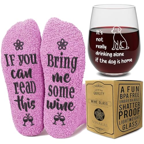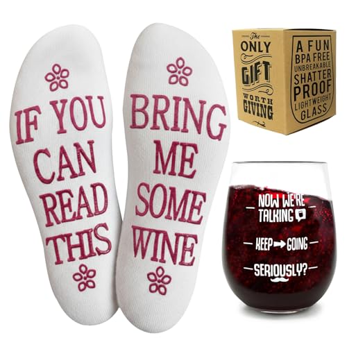 {"about_product": ["WINE GLASS GIFT SET - This unbreakable 16oz stemless wine glass with sayings would make the perfect gifts for women who have everything, packaged with a nice pair of Funny Wine Socks!", "UNBREAKABLE 16oz Stemless wine glass funny - It holds 16 oz or 450mL. That's almost half a bottle! BPA Free Tritan Acrylic Plastic Glasses are stemless and shatterproof so they are ideal as wine accessories. \"Seriously?, Keep Going!, Now We're Talking!", "FUNNY SOCKS - ONE SIZE FITS ALL - Made of 80% combed cotton, with rubber anti-slippery letters on the bottom. Comfortable Wine Socks for Women “If You Can Read This, Bring Me Some Wine\"", "GIFT READY PACKAGING - These come in a pretty box that reads \" The Only Gift Worth Giving\". So forget about wrapping paper! Don't let go on this funny wine glasses for women set!", "PERFECT WINE GIFTS FOR WOMEN - Put a smile on their face and make them feel special! Christmas gifts for women, hilarious gifts for coworkers, fun wine glasses for women, white elephant gifts or any occasion you can think."], "product_description": null, "product_information": {"ASIN": "B07R5G1XKC", "Size": "3 Piece Set", "Brand": "The ONLY GIFT WORTH GIVING", "Color": "Funny Socks & Wine Glass", "Shape": "Cylindrical", "Style": "Seriously?", "Theme": "Funny", "Pattern": "Letter Print", "Unit Count": "1.0 Count", "Finish Type": "glossy or smooth", "Item Weight": "2 ounces", "Reusability": "Reusable", "Manufacturer": "VINAKAS", "Number of Items": "2", "Special Feature": "Break Resistant", "Material Feature": "Break Resistant", "Best Sellers Rank": "#11,302 in Kitchen & Dining (See Top 100 in Kitchen & Dining) #110 in Wine Glasses", "Item model number": "TritanSeriouslyWine2", "Material Type Free": "BPA Free", "Product Dimensions": "3\"W x 6\"H", "Included Components": "Funny Socks, Packaging, Wine Glass", "Date First Available": "April 27, 2019", "Customer Package Type": "Standard Packaging", "Age Range (Description)": "Adult", "Product Care Instructions": "Dishwasher Safe", "Recommended Uses For Product": "Home", "Is Discontinued By Manufacturer": "No", "Global Trade Identification Number": "00854184008181"}, "product_details": {"Brand": "The ONLY GIFT WORTH GIVING", "Color": "Funny Socks & Wine Glass", "Capacity": "16 Fluid Ounces", "Material": "Plastic", "Special Feature": "Break Resistant"}}