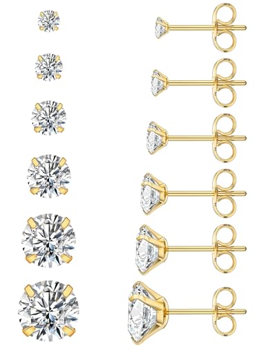 {"about_product": ["SET OF 6 PAIRS - Package includes 6 pairs of stud earrings in 5 sizes, 3mm/4mm/5mm/6mm/7mm/8mm. Gauge Size: 20G =0.8mm, pin size: 10 mm. The butterfly buckle add extra protection for you.", "SHINY CUBIC ZIRCONIA - Made of high quality AAA+ cubic zirconia, which is luxury and classic, perfectly match your various wearing style, make you the focus in the crowd.", "FINE CRAFT - The fine craft of plating and 316L stainless steel makes this stud earrings set a perfect gift for your loved ones. 100% lead-free for any sensitive skins.", "FOR ANY OCCASIONS - Our stud earrings set off your charming temperament in any occasions, perfect for wedding, engagement, anniversary, graduation, party, prom, etc.", "NO RISK PURCHASE - If you have any questions about our products, please feel free to contact us and we will resolve your issue within 24 hours."], "product_description": "", "product_information": {"ASIN": "B0F3CY77FD", "Department": "womens", "Customer Reviews": "4.4 4.4 out of 5 stars \n\n (12,649)", "Product Warranty": "For warranty information about this product, please click here", "Best Sellers Rank": "#4,760 in Clothing, Shoes & Jewelry (See Top 100 in Clothing, Shoes & Jewelry) #24 in Women's Stud Earrings", "Date First Available": "January 10, 2024"}, "product_details": {"Gem type": "Cubic Zirconia", "Material": "14K Yellow Gold+Hypoallergenic surgical steel", "Item width": "0.8 millimeters", "Metal type": "14k yellow gold+hypoallergenic surgical steel", "Back Finding": "Screw Back", "Earring design": "Stud"}}