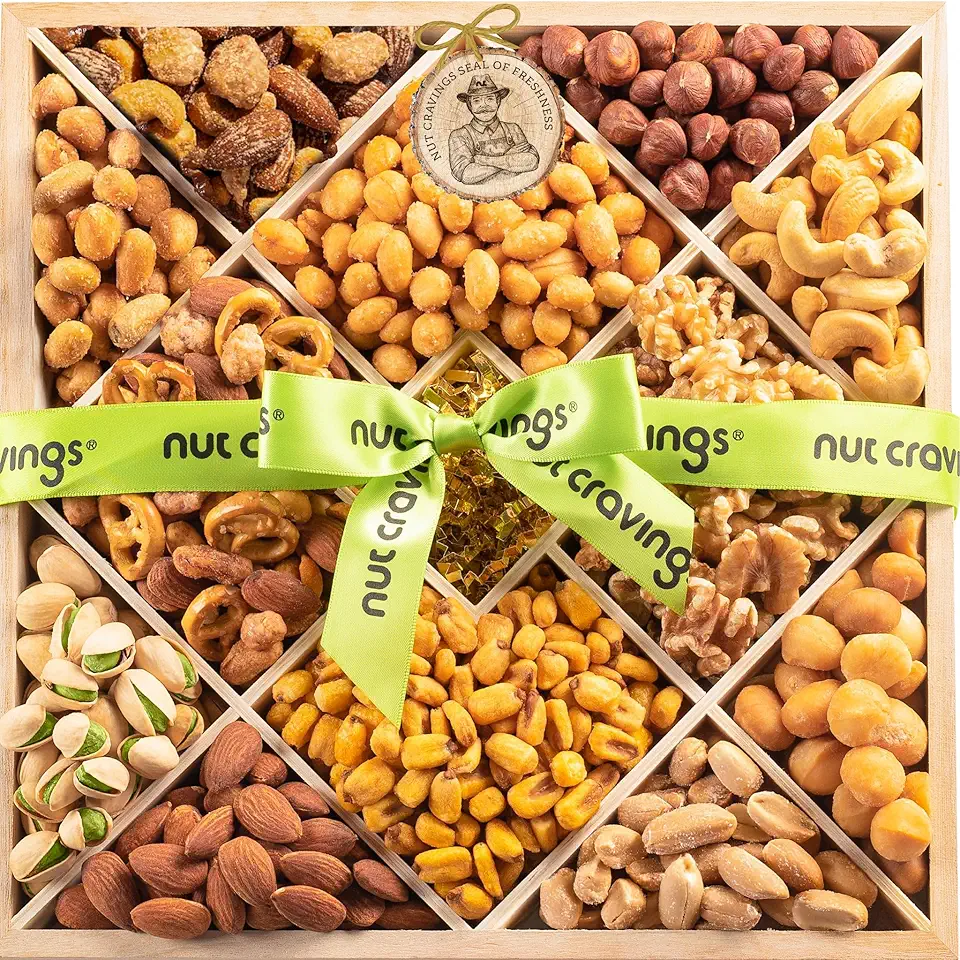 NUT CRAVINGS - Holiday Christmas Mixed Nuts Gift Basket in Reusable Diamond Wooden Tray + Green Ribbon (12 Assortments) Xmas Treats for Adults, Food Arrangement Healthy Snack Care Package, Kosher