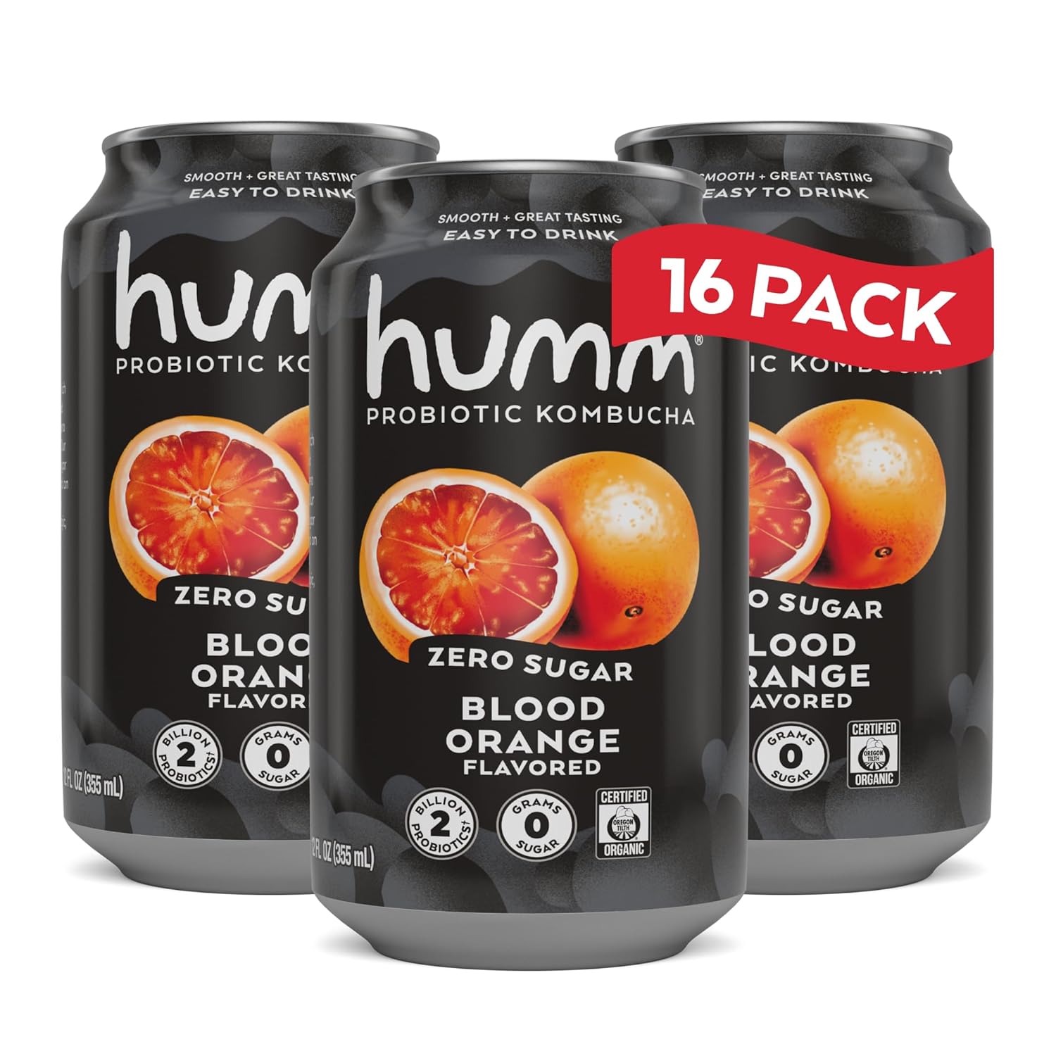 {"about_product": ["BLOOD ORANGE : A vibrant citrus burst and juicy sweetness of blood orange combines with the refreshing effervescence of kombucha for big taste and zero sugar! At Humm, we didn't invent kombucha, we perfected it. We’re flavor-forward and easy to drink without the vinegar taste.", "2 BILLION PROBIOTICS : Show your gut some love (that won’t fizz out!) with our 2 billion probiotics in every can to help tackle bloating, gas, digestive and skin issues. Did you know some of these other guys don’t even have probiotics? Phew!", "100% REAL & VITAMIN B12 PACKED : Did you think we'd stop at 2 billion probiotics? No way! Our zero sugar kombucha also contains vitamin B12 for a boost to get you through the day. Certified organic, non-GMO, vegan, keto-friendly, (less than 1 net carb per can!) and gluten free. When we say “drink better,” we mean it.", "ZERO SUGAR : Our proprietary process eliminates sugar during fermentation, making it 10 calories per can. The sweetness you taste? It’s all natural and plant-based.", "SHELF STABLE : No sugar means there's nothing for the good bacteria to continue feeding on, so no refrigeration is needed. But as the taste experts, we still think Humm Zero is best served nice and cold. Cheers to your health!"], "product_description": null, "product_information": {"ASIN": "B086SDXCY2", "Units": "192 Fluid Ounces", "Manufacturer": "Humm", "Customer Reviews": "4.4 4.4 out of 5 stars \n\n (2,370)", "Best Sellers Rank": "#5,843 in Grocery & Gourmet Food (See Top 100 in Grocery & Gourmet Food) #3 in Kombucha Tea", "Package Dimensions": "10.98 x 10.91 x 5.59 inches; 12 ounces"}, "product_details": {"Brand": "Humm", "Flavor": "Blood Orange", "Item Form": "Liquid", "Unit Count": "192 Fluid Ounces", "Tea Variety": "Green"}}