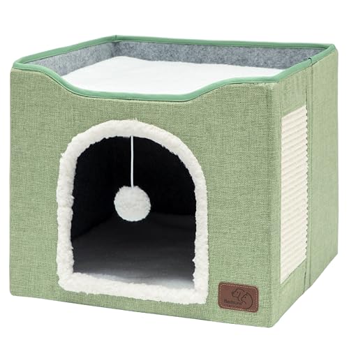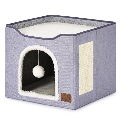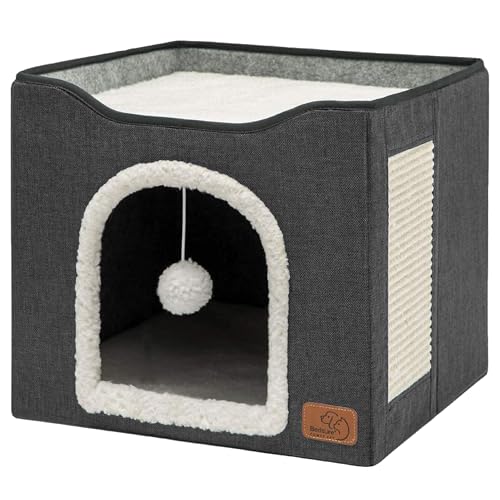 {"about_product": ["Private & Cozy: The enclosed bottom area provides a hidden space for cats, small dogs, and rabbits to sleep in, while the upper platform can be used as an all-purpose nap pad to look out the window, lounge, and unwind. Great for multi-cat households.", "Spacious Comfort: The cat hideout's bottom compartment measures 16.5 x 16.5 x 13\", ensuring a spacious yet cozy den for cats of all ages. The top platform is larger than most brands, providing plenty of room for your cat to stretch out and get cozy.", "Pet Safe Design: Cat hideaway made from pet-friendly MDF materials with CARB Certification and soft lambswool fabric. This large cat house is equipped with a durable sisal scratching board and plush hanging ball to keep your cat engaged and happy.", "Sturdy & Stylish: Constructed with sturdy and lightweight MDF boards for added durability. The classic style works anywhere in the home, from the living room to your bedroom, an office, the garage, or wherever your pet needs a cozy cat cave. Surroundings of the cat houses & condos and the top cushion is made of lightweight and sturdy MDF boards. Cats under 20 Lbs can jump and play freely.", "Easy Care & Assembly: This cat cube for indoor cats can be quickly assembled or folded flat for easy storage and travel. Portable and lightweight. The removable cushions feature reversible, machine-washable covers that provide all-season comfort."], "product_description": null, "product_information": {"ASIN": "B08CY5VR5W", "Size": "Single", "Color": "Grey", "Style": "Modern", "Material": "pet-friendly MDF materials with CARB Certification and soft lambswool fabric", "Brand Name": "Bedsure", "Item Weight": "4.92 Pounds", "Manufacturer": "Bedsure Comfy Pet", "Care Instructions": "Machine Washable", "Breed Recommendation": "All Breed Sizes", "Date First Available": "July 14, 2020", "Age Range Description": "All Life Stages", "Item Dimensions LxWxH": "16.5 x 16.5 x 14 inches", "Target Audience Keyword": "house-cats, small-animal-pets", "Specific Uses for Product": "Indoor", "Item Package Dimensions L x W x H": "16.97 x 13.5 x 4.16 inches"}, "product_details": {"Brand": "Bedsure", "Color": "Grey", "Style": "Modern", "Material": "pet-friendly MDF materials with CARB Certification and soft lambswool fabric", "Product Dimensions": "16.5"D x 16.5"W x 13"H"}}