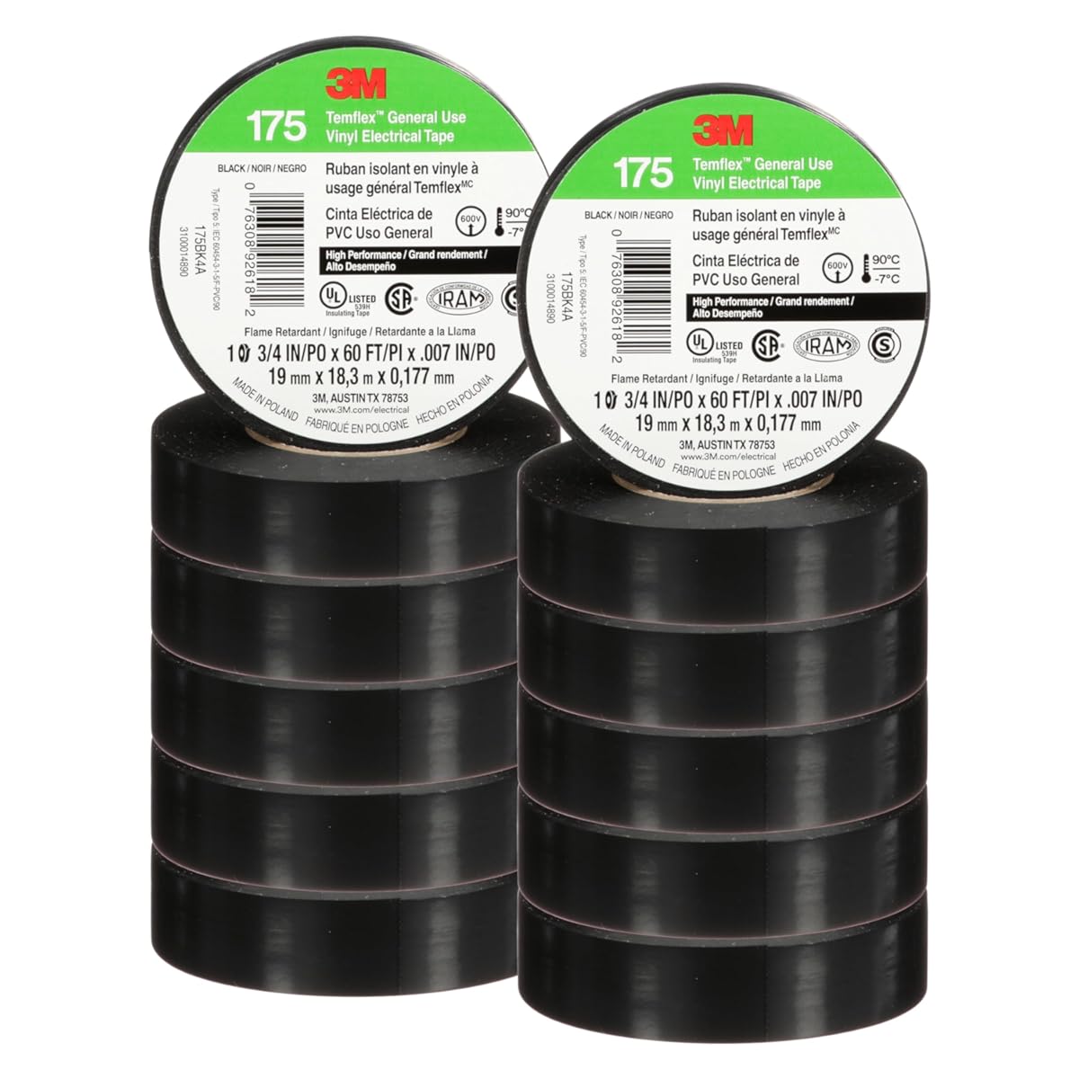 {"about_product": ["FOR INDOOR AND PROTECTED OUTDOOR USE: Use where it is required to have a more sustainable, vinyl electrical tape with no volatile organic compounds (VOCs)", "PRIMARY INSULATION: Use as insulation on applications up to 600 V at maximum temperature of 80 °C (176 °F) and minimum temperature of -10 °C (14 °F) on joints and splices in wires and cable (UL510)", "OVERWRAP BUILD-UP: For the harnessing and bundling of wires and cables where build-up is needed and minimum bulk is required", "CSA C22.2 No.197: Primary insulation to 1000 V at maximum temperature of 90 °C (194 °F) and minimum temp of 0 °C (32 °F) on joints and splices in wires and cables in accordance with the Canadian Electrical Code, Part 1", "IEC 60454-3-1: Classification Type 6, Designation IEC 60454-3-1-6/F-PVCP/90 for thermal index of 90 °C (194 °F) and a minimum temperature rating of -10 °C (14 °F)", "CERTIFICATION: UL and CSA Listed, VDE Certified and RoHS Compliant", "STABILITY: 5-year shelf life from the date of manufacture", "For industrial/occupational use only. Not for consumer sale or use"], "product_description": "3M Temflex Vinyl Electrical Tape 175 is a 7-mil thick, high-performance general-purpose vinyl insulating tape. It is flame-retardant and designed to perform in ambient temperatures up to 194F (90C). The tape is conformable for cold weather application down to 19F (-7C). It has excellent resistance to abrasion, moisture, alkalies, acid, copper corrosion and varying weather conditions. The combination of an elastic PVC backing and pressure-sensitive rubber-based adhesive provides electrical and mechanical protection with minimum bulk. This versatile electric tape is compatible with rubber and synthetic splicing compounds, and is UL Listed and CSA Certified. Commonly used in these types of applications: - UL510: As primary insulation on applications up to 600V at max temperature of 80C (176F) and min temperature of -10C (14F) on joints and splices in wires and cables in accordance with NFPA 70, National Electrical Code - CSA C22.2 No.197: Primary insulation on applications up to 1000V at max temperature of 90C (194F) and min temperature of -7C (19F) on joints and splices in wires and cables in accordance with Canadian Electrical Code, Part 1 - IEC 60454-3-1: Classification Type 6, Designation IEC 60454-3-1-6/F-PVCP/90 for thermal index of 90C (194F) and min temperature rating of -10C (14F) - Industrial, commercial and residential environments - Where it is required to have a more sustainable, vinyl electrical tape with no VOCs (volatile organic compounds) and 100% solvent-free manufacturing process with lower emissions - Where Flame Retardant and Cold Resistance rating is required – UL510 - Cable jacket repair (up to 600V (UL) / 1000V (CSA) as primary insulation) and as mechanical protection when overwrapping rubber splicing, and mastic tapes used on LV/MV/HV joints and splices - Indoor and weather protected outdoor operations as determined by end-user where use of a professional grade vinyl electrical tape is not required", "product_information": {"ASIN": "B08KHNZ3KR", "Manufacturer": "3M", "Customer Reviews": "4.7 4.7 out of 5 stars \n\n (637)", "Best Sellers Rank": "#6,067 in Industrial & Scientific (See Top 100 in Industrial & Scientific) #39 in Electrical Tape", "Item model number": "92618", "Product Dimensions": "7.76 x 3.35 x 3.23 inches; 2.01 Pounds", "Date First Available": "October 1, 2020"}, "product_details": {"Brand": "3M", "Color": "Black", "Material": "Copper, Polyvinyl Chloride, Rubber, Vinyl", "Number of Items": "10", "Recommended Uses For Product": "Electrical"}}
