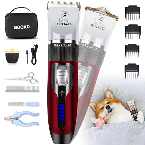 {"about_product": ["【2 Blade in 1 Set】Wide Blade for thick coats. Narrow Blade for hair around paws, rump, face, ear, beard and mustache. ALL-IN -ONE,We Have All The Tools Needed For Pet Grooming.", "【Long Lasting Battery & LCD display】2200mA High Capacity Li-ion Battery, charging for 3 hours and can sustain use of 250 minutes.for reminding using and charging. Rechargeable design of this dog clipper, you don't have to buy replace batteries.", "【Safe and Sharp Blade】High quality 33-tooth titanium blade and ceramic movable blade cooperate to provide excellent cutting performance, while surpassing the standard 24 or 26-tooth blades including most pet clippers. It always keeps sharp and ensures high durability. Detachable blades, easy to change and clean.", "【Low Noise & Strong Power 】Q-SUS Low-Noise-Tech lowers the noise less than 60db. Adopt silver Pd-alloy 3 speed motor, heavy-duty and durable. 5 Size Fine Tuning Knob,Dog clipper has 0.8mm-2.0mm Fine Tuning Knob, which allow you to adjust different hair lengths for versatility. This High Performance dog grooming kit help you get the suitable length for the pet coat.", "【Take Your Pet on a Long Journey】Multifunctional tool kit, easily store and protect your clipping tools. It is also convenient for you to bring the haircut kits to travel. GOOAD will always help you whenever."], "product_description": null, "product_information": {"ASIN": "B08L6NZQMH", "Batteries": "1 Lithium Ion batteries required. (included)", "Manufacturer": "Gooad", "Customer Reviews": "4.5 4.5 out of 5 stars \n\n (6,168)", "Best Sellers Rank": "#10,929 in Pet Supplies (See Top 100 in Pet Supplies) #42 in Dog Grooming Clippers", "Item model number": "KIT001", "Product Dimensions": "2.87 x 5.94 x 8.43 inches; 1.43 Pounds", "Date First Available": "October 14, 2020"}, "product_details": {"Brand": "Gooad", "Color": "Gold", "Item Weight": "650 Grams", "Power Source": "Battery Powered", "Recommended Uses For Product": "Beard, Ear, Face, Mustache"}}