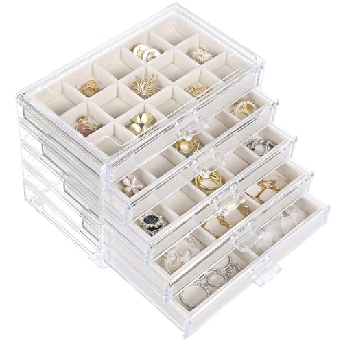 {"about_product": ["[See-through Design] With the transparent shell, you can store your everyday earrings all in a place for easily view and access, no search for matching pair and smooth start a new today", "[Spacious & Compact] This earring jewelry box has 15 small slots in each first 3 levels, 6 medium compartments in fourth drawer and 2 larger area in the last tier which great to holding small earring studs or large earring hoops", "[Customize & Stackable] Each partition and drawer are easy to adjust, you can customize and adapt to your daily needs. 4 rubber anti-skid pads on the shell bottom that can be stacked in the 4 small grooves on the top, you can stack 2 boxes or more", "[Sturdy & Long-lasting] 0.17 inch tough acrylic in the outside, including shell and drawers. Soft velvet-like fabric wrapped MDF board in the internal tray. Drawers slide open smoothly and handles are easy to grip", "[Sleek & Stylish] Unique transparent design creates a visually attractive display that coordinates with any style or existing decoration, ideal present for any earring-love."], "product_description": null, "product_information": {"ASIN": "B091DZQLHV", "Size": "5 Drawers", "Brand": "misaya", "Color": "Cream", "Shape": "Rectangular", "Style": "Modern", "Usage": "Earring Organizer, Gift", "Finish": "Polished", "Material": "Acrylic", "Finish Type": "Polished", "Item Weight": "4.24 pounds", "Mounting Type": "Freestanding", "Warranty Type": "No Warranty", "Inner Material": "Engineered Wood", "Number of Items": "1", "Special Feature": "Durable,Jewelry Organizer,See-through", "Target Audience": "Mother", "Number Of Pieces": "1", "Special Features": "Durable,Jewelry Organizer,See-through", "Best Sellers Rank": "#14,782 in Clothing, Shoes & Jewelry (See Top 100 in Clothing, Shoes & Jewelry) #83 in Jewelry Boxes", "Number of Drawers": "5", "Product Dimensions": "6\"D x 9.2\"W x 6.7\"H", "Batteries Included?": "No", "Batteries Required?": "No", "Date First Available": "March 31, 2021", "Jewelry Storage Type": "Jewelry Box", "Item Package Quantity": "1", "Number of Compartments": "53", "Recommended Uses For Product": "Dressing Room"}, "product_details": {"Brand": "misaya", "Color": "Cream", "Shape": "Rectangular", "Style": "Modern", "Material": "Acrylic", "Finish Type": "Polished", "Special Feature": "Durable,Jewelry Organizer,See-through", "Target Audience": "Mother", "Product Dimensions": "6"D x 9.2"W x 6.7"H", "Recommended Uses For Product": "Dressing Room"}}