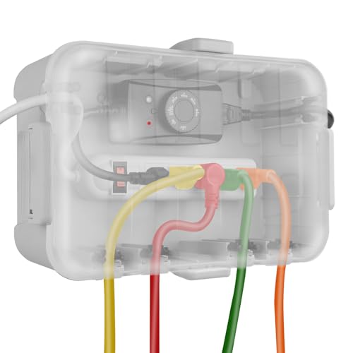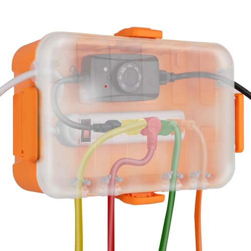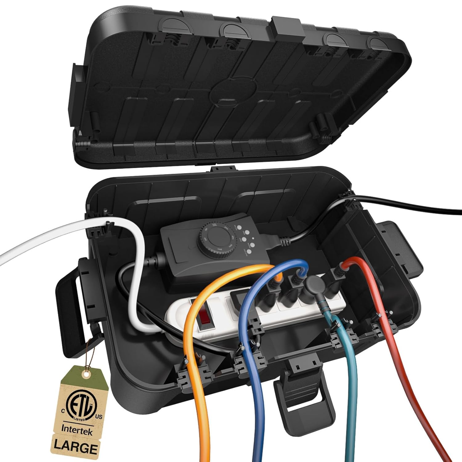 {"about_product": ["DIMENSIONS: External size is 12.5 x 8.5 x 5 inch. Inner size is 12 x 7.4 x 3.9 inch. 6*entry ports fit up to 12AWG/3C or Φ12mm cord.", "READ BEFORE PURCHASE: Each package only includes 1*outdoor electrical box. The power strip, surge protector, outdoor timer, extension cord and all other device are not included.", "Keep outdoor cord connection secure and protected. Great for keeping Christmas inflatable decor running while safeguarding its electrical safety. With the 4 clips, top lid, and rubber gaskets, this outdoor extension cord cover box is IP54 waterproof. Perfect to seal 12/14/16 gauge cord, braided cable and flat wire. Features with large space, good to protect your outdoor power strip, timer outlet plug, extension cord, large adapter.", "Easy to use, place the connection into the safety seal enclosure and clip the cord with the clamps. Simple to hang the box on any walls with the dual mounting holes.", "Ideal for a wide range of outdoor & indoor applications including wooden patio, lawn and garden power tools, Christmas holiday lighting, landscape decorations, pool pumps, fountains, fish ponds, patio heaters, hot tub, air conditioners, security cameras and more.", "Waterproof Tips: Do not place more than one cable in each port; Place the electrical box parallel to the ground, but do not place it vertically or obliquely; Do not submerge the box in water or bury it.", "Safety Certifications: Conforming to UL50, UL50E, and CSA C22.2 No. 94.1/94.2 Standards."], "product_description": null, "product_information": {"ASIN": "B09NLW5HMX", "Manufacturer": "Flemoon", "Customer Reviews": "4.6 4.6 out of 5 stars \n\n (4,495)", "Best Sellers Rank": "#980 in Tools & Home Improvement (See Top 100 in Tools & Home Improvement) #3 in Electrical Boxes", "Item model number": "7003", "Product Dimensions": "12.5 x 8.5 x 5 inches; 2.05 Pounds", "Date First Available": "December 14, 2021"}, "product_details": {"Brand": "Flemoon", "Color": "Black", "Style": "Modern", "Material": "Polypropylene", "Product Dimensions": "8.5"D x 12.5"W x 5"H"}}