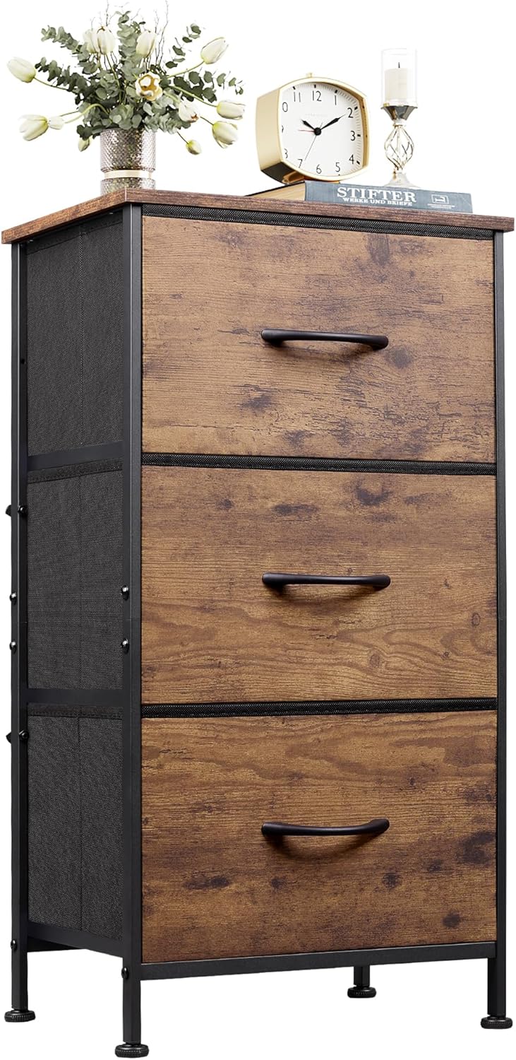 {"about_product": ["MULTIFUNCTION CABINET: Match perfectly with other WLIVE storage towers; This chest of drawers is great for closets, bedrooms, nurseries, playrooms, entryways and more", "SUFFICIENT STORAGE SPACE: Drawers are great for organizing your clothes, blankets, scarves, socks and other accessories; Wood top provides hard surface for displaying lamps, clocks, books, glasses etc.", "STURDY STRUCTURE: Strong steel frame and water-resistant wood top offers stable support and ensue years of use; High-quality non-woven fabric drawers is easy to clean", "3 DRAWER CHEST: Features 3 removable foldable drawers; Easy pull handle helps open and close the drawers simply; 4 adjustable plastic feet protect your floor from scratches", "EASY ASSEMBLY: Easy to assemble with hardware included; This nightstand measures: 15.7\" L x 11.8\" W x 29.5\" H"], "product_description": null, "product_information": {"ASIN": "B09SH1CKKS", "Size": "11.8\"D x 15.7\"W x 29.5\"H (3 Drawers)", "Brand": "WLIVE", "Color": "Rustic Brown Wood Grain Print", "Room Type": "Bedroom, Living Room, Closet, Entryway, College Dorm", "Model Name": "ASNG072 Fabric 3 Drawer Storage Cabinet / DHS2", "Drawer Type": "Center Mounted Slide", "Item Weight": "10.56 pounds", "Finish types": "Polished", "Manufacturer": "WLIVE", "Warranty Type": "Full", "Furniture Finish": "Rustic brown top and rustic brown wood grain print drawer", "Number of Pieces": "1", "Assembly Required": "Yes", "Best Sellers Rank": "#17,891 in Home & Kitchen (See Top 100 in Home & Kitchen) #24 in Dressers & Chests of Drawers", "Item model number": "ASNG072DHS2", "Batteries required": "No", "Product Dimensions": "11.8\"D x 15.7\"W x 29.5\"H", "Included Components": "Dresser, Assembly Guide, Installation Tool", "Product Care Instructions": "Wipe with Dry Cloth"}, "product_details": {"Brand": "WLIVE", "Material": "MDF board, Non-woven fabric, Steel frame", "Finish Type": "Polished", "Number of Drawers": "3", "Product Dimensions": "11.8"D x 15.7"W x 29.5"H"}}