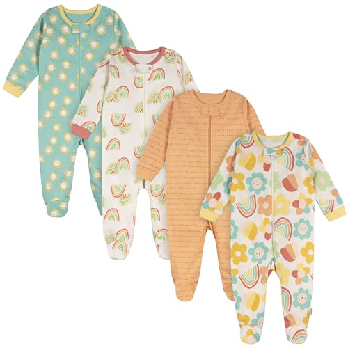 {"about_product": ["Includes four Sleep 'n Plays", "Made with soft, breathable cotton jersey that's gentle on sensitive skin", "Features long sleeves, a front zipper with safety tab for comfort & footed for warmth.", "Layer underneath with our Onesies bodysuits for extra warmth. Perfect for newborns!", "Purple, white & mint green color scheme with floral & rainbow art", "Target gender: female"], "product_description": "Discover bedtime comfort with this four-pack of Sleep 'N Plays, perfect for your little one’s all-day adventures and nap time needs. Crafted from 100% cotton, these adorable outfits are gentle on sensitive skin, providing a soft, breathable fit that’s perfect for every activity. The full-length zipper makes dressing and diaper changes quick and easy, while the ribbed neckline with a zipper protector ensures a snug, irritation-free fit. With their footed style, these Sleep 'N Plays offer an extra cozy touch, keeping your baby warm and comfy whether they’re playing, napping, or just lounging around.", "product_information": {"ASIN": "B0BRK4F975", "Department": "baby-girls", "Manufacturer": "Onesies Brand", "Customer Reviews": "4.7 4.7 out of 5 stars \n\n (17,113)", "Best Sellers Rank": "#2,186 in Clothing, Shoes & Jewelry (See Top 100 in Clothing, Shoes & Jewelry) #3 in Baby Girls' One-Piece Footies", "Item model number": "3447741DA", "Date First Available": "April 1, 2020"}, "product_details": {"Origin": "Imported", "Fabric type": "100% Cotton", "Care instructions": "Machine Wash"}}