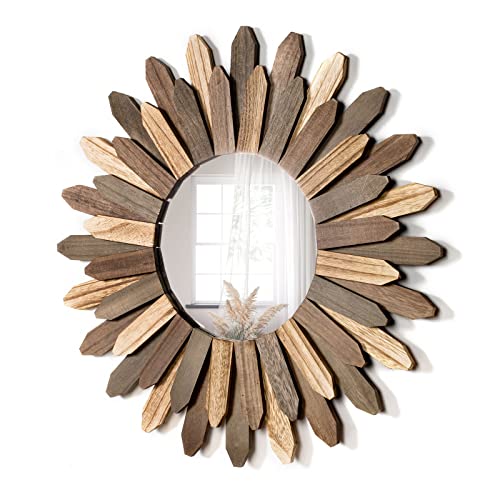 {"about_product": ["Rustic Wall Decor for Living Room: This decorative mirror made of solid wood, mix with carbonized black, weathered walnut and weathered grey color, the beautiful wood texture makes it an antique accent, this stylish and eye-catching decor piece is the perfect addition to your house.", "Boho Wall Decor Mirror: The design of wood sunburst base on the element of boho style, it will be a nice touch and goes well with your others boho decor style; decent decorative piece with perfect size for wall mounted or lean on wall at desk, perfect for your bedroom, living room, bathroom, kitchen and more", "No Distortion Farmhouse Wall Decor Mirror: This vintage mirror made of high quality high polish silver glass which can prevent distortion, which give you a real HD imaging. High quality coating for the ultimate durability and rust protection.", "Easy to Hang: Measure at 12 inch diameter with wood frame and diameter of 5.8 inch for mirror; Hang this boho wall art in your bedroom over your bed, in your hallway or entryway, over your living room sofa. No any assembly, quite easy to hang on the wall; Comes with anchor and screw.", "Aesthetic Gift for Choice: This wall decor mirror could be an ideal gift to your friends at birthday,Christmas,Thanksgiving Day or New Year gift."], "product_description": null, "product_information": {"ASIN": "B0BFH9SZ2V", "Size": "12 inch (1 pack)", "Brand": "Honiway", "Color": "Tril Color", "Shape": "Sunburst", "Style": "Country Rustic", "Theme": "Antique,Rustic,Sunburst", "Material": "Wood", "Room Type": "Bathroom, Bedroom, Kitchen, Living Room, entryway", "Is Lighted": "No", "Finish Type": "Hand-made", "Frame Color": "black", "Item Weight": "14.4 ounces", "Manufacturer": "Honiway", "Mounting Type": "Wall Mount", "Frame Material": "Wood", "Number of Items": "1", "Number of Packs": "1", "Special Feature": "boho wall mirror with wood sunburst, for bedroom living room hallway entryway basement foyer", "Number of Pieces": "1", "Assembly Required": "No", "Best Sellers Rank": "#31,056 in Home & Kitchen (See Top 100 in Home & Kitchen) #28 in Wall-Mounted Mirrors", "Product Dimensions": "12\"L x 12\"W", "Date First Available": "November 12, 2022", "Recommended Uses For Product": "Bedroom, Living Room, Bathroom, Kitchen, Entryway, Hallway, Foyer"}, "product_details": {"Brand": "Honiway", "Shape": "Sunburst", "Room Type": "Bathroom, Bedroom, Kitchen, Living Room, entryway", "Frame Material": "Wood", "Product Dimensions": "12"L x 12"W"}}