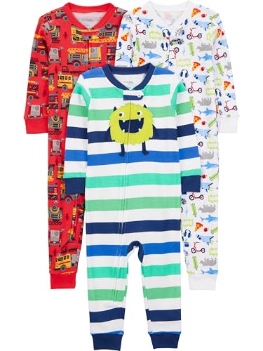 {"about_product": ["3-Pack Value: Three footless pajamas, convenient and affordable multi-pack for everyday bedtime comfort.", "Full Zip Front Closure: Full-length zipper from neck to ankle, making it easy to dress and undress your child, perfect for quick changes.", "Safety Chin Tab: A protective chin tab is included at the top of the zipper to prevent irritation or scratches on your child’s skin, ensuring comfort during sleep.", "Footless Design: Allows him to move freely and also accommodates growth spurts, different sock or slipper choices.", "Soft Fabric: Ultra-soft to keep him comfortable all night long.", "Fun Prints and Colors: Variety of vibrant colors and playful prints make bedtime more fun for kids."], "product_description": "These footless 1-piece pajamas take them from nap time to play time in no time! includes 3", "product_information": {"ASIN": "B0DHSHV82C", "Department": "unisex-child", "Manufacturer": "Carter's Simple Joys - Private Label", "Customer Reviews": "4.8 4.8 out of 5 stars \n\n (53,582)", "Best Sellers Rank": "#1,178 in Clothing, Shoes & Jewelry (See Top 100 in Clothing, Shoes & Jewelry) #9 in Baby Boys' Pajama Sets", "Date First Available": "September 23, 2024"}, "product_details": {"Origin": "Imported", "Fabric type": "100% Cotton", "Care instructions": "Machine Wash"}}