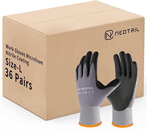 {"about_product": ["【Superior Hand Protection】 The microfoam nitrile coating on the palm and fingers provides reliable grip and control in damp, wet and oily conditions, With these coated work gloves, you can keep your hands clean and protected from oil and grease. It's a great choice for anyone who needs reliable hand protection for general handling tasks.", "【Comfortable, Breathable & Flexible】13 gauge knit nylon seamless shell and microfoam technology coating offers increased comfort and a 360 degrees of breathability, making the safety work gloves more breathable and keeping your hands dry at all times. Ergonomic designed comfortable 3D snug fit into all fingers, improving fingertip sensitivity and flexibility, wearing maxiflex work gloves can also use your smartphone or other touch screen devices.", "【Multipurpose】 Machine washable for easy cleaning and maintenance, quick drying. NEOTRIL rubber coated work gloves are perfect for light duty work,ideal for applications in automotive, construction, logistic, warehouse, moving, handling, cleaning, driving, gardening, assembling, gardening and DIY duty works.", "【More Details】CE certified with EN388:4131 (Abrasion:4 Cut:1 Tear:3 Puncture:1); Knit wrist design helps prevent dirt and debris from entering the mens work gloves.", "【Care Instructions】Size available from S to XL,different bulk pack (3/6/12/36 pairs); Recommend washing gloves in tempered water not exceeding 104°F or 40°C. Wash in a 5-10 minute cycle time, Rinse in cold water, Tumble dry at temperature not exceeding 104°F or 40°C."], "product_description": null, "product_information": {"ASIN": "B0BNB1P8V7", "Department": "Unisex Adult", "Customer Reviews": "4.6 4.6 out of 5 stars \n\n (2,207)", "Product Warranty": "For warranty information about this product, please click here", "Best Sellers Rank": "#1,266 in Tools & Home Improvement (See Top 100 in Tools & Home Improvement) #17 in Safety Work Gloves", "Date First Available": "November 25, 2022"}, "product_details": {"Origin": "Made in the USA or Imported", "Care instructions": "Machine Wash"}}
