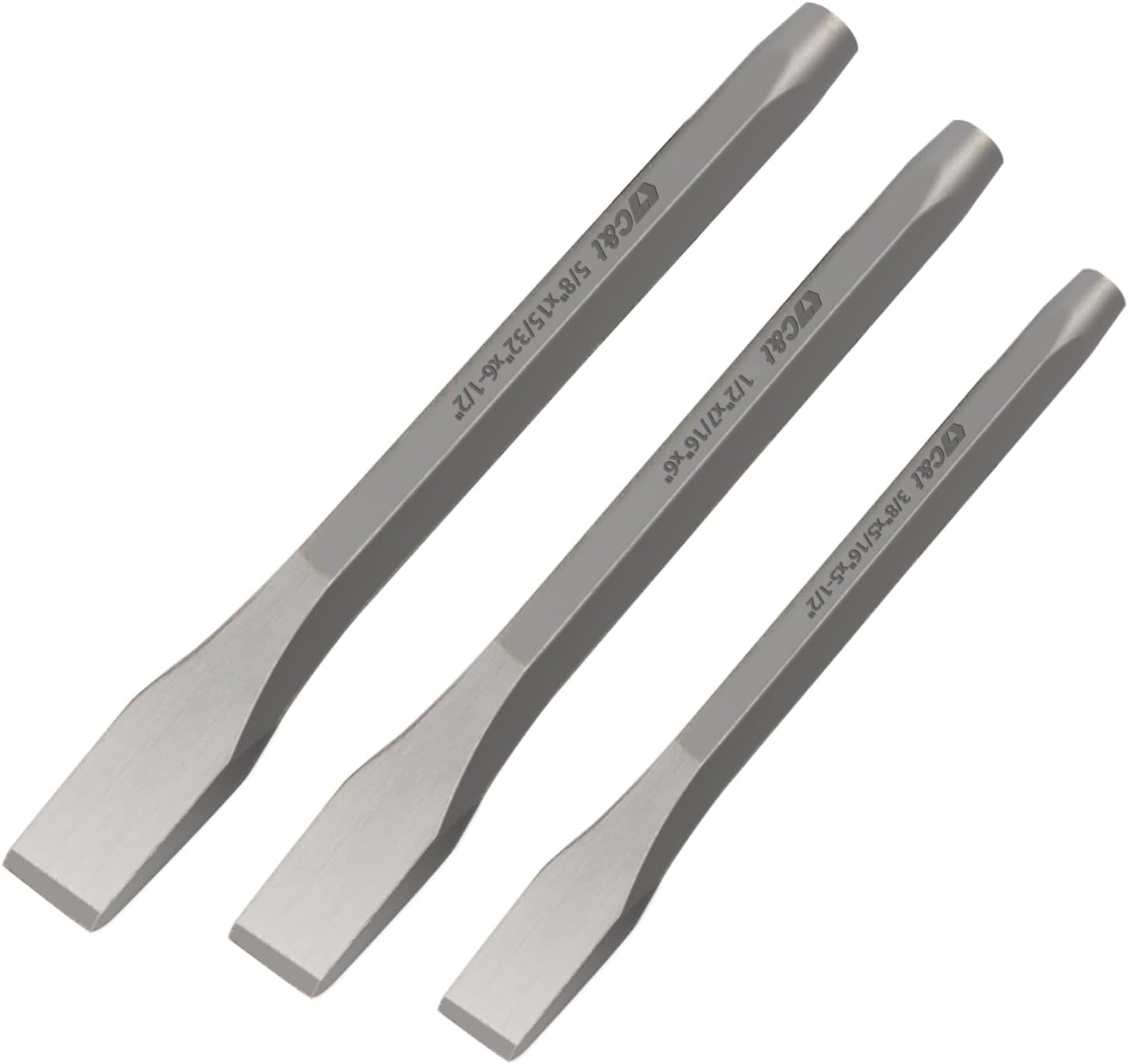 {"about_product": ["【Package Include】3-Piece Cold Chisels Set include 3/8\" , 1/2\" , 5/8\" .", "【Premium Material】Cold Chisels tools made from heat-treated chrome vanadium steel for enhanced toughness, durability, and wear resistance. Hardness: 54~58HRC. This set has a high hardness rating and can be used multiple times to prevent dulling.", "【Clear Size Markings】Each chisel marked with a size so they can be found quickly for the next use.", "【Wide Application】For cutting rivets, rods and bolts, removing welding slag and scrap, forming steel, brass, bronze, cast iron and aluminium.", "【Quality Assurance】If there are any defects or problems with the product, please contact our excellent customer service team."], "product_description": null, "product_information": {"ASIN": "B0C9TLTHNM", "Size": "3-Piece", "Brand": "C&T", "Blade Edge": "Bevel", "Item Weight": "12.3 ounces", "Part Number": "C&T8-5", "Manufacturer": "C&T", "Power Source": "NO", "Blade Material": "Chromium-Vanadium Steel", "Best Sellers Rank": "#23,018 in Tools & Home Improvement (See Top 100 in Tools & Home Improvement) #3 in Metalworking Chisels", "Item model number": "C&T8-5", "Product Dimensions": "9.8\"L x 3.4\"W", "Batteries Included?": "No", "Batteries Required?": "No", "Included Components": "NO", "Date First Available": "July 19, 2023", "Item Package Quantity": "1"}, "product_details": {"Size": "3-Piece", "Brand": "C&T", "Blade Edge": "Bevel", "Blade Material": "Chromium-Vanadium Steel", "Product Dimensions": "9.8"L x 3.4"W"}}