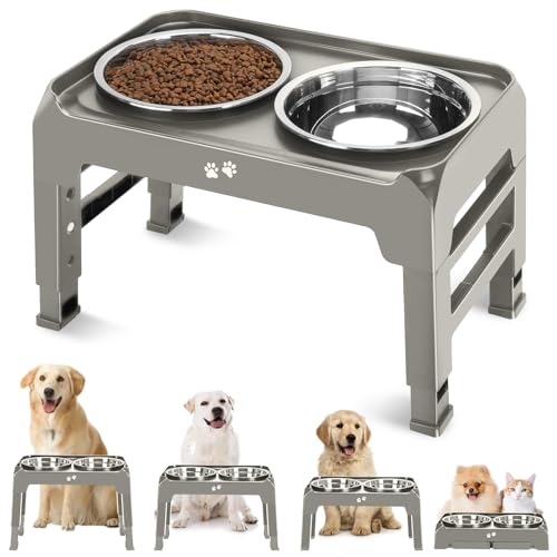 {"about_product": ["?Adjustable Height Dog Bowl Stand for Dogs of All Sizes: Say goodbye to bending down! Our elevated dog bowls can be adjusted to 4 different heights: 3.7\", 9.2\", 10.75\", and 12.36\", accompany then from puppy to full grown. The raised dog bowl can not only makes it easier and comfortable for dogs to access their food and water, but also prevents dust or floor debris from falling into the bowls, ensuring a clean and healthy dining experience.", "?Neck and Joint Protection: Our raised dog food bowls not only help the dogs eat more ergonomically, protecting their necks and spines while relieving pressure on their joints, but also promote healthier digestion. This is an essential item, particularly for dogs who tend to vomit while eating, have mobility issues, or suffer from arthritis. The rounded corners of the bowl stand also help prevent accidental bumps or injuries. (Much safe and healthy dog bowls for medium large dogs.", "?Dual 50 oz Thickened Stainless Steel Bowls with Larger Capacity: Welcome to compare! We've upgraded our stainless steel bowls to be thicker and larger than others, ensuring the long-lasting durability and a perfect fit for large-sized dog. Additionally, our bowl holder is cleverly crafted with raised edges for effortless pick-up, rather than reaching underneath the bowl and pushing them up to get them out. The dog bowl is also dishwasher safe and detachable, making cleaning a breeze.", "?Anti-slip, Silent & Sturdy: The noiseless rubber edges and anti-skid foot pads on our elevated dog bowl stand ensure the bowls and stand stay stable even during vigorous eating. Say goodbye to sliding and noisy mealtimes! Additionally, our dog bowls not only provide a peaceful dining experience but also protect your floor from scratches caused by bowls moving around like other dog feeder.", "?No Installation & Folds Up Nice for Traveling: The detachable design and foldable legs make it easy to pack and much space-saving, perfect for both home and travel. No assembly required. Simply unfold the legs and press down to use. Adjusting the height is a breeze too – just press the white button and pull the legs to your desired height."], "product_description": null, "product_information": {"ASIN": "B0C9WMRSHV", "Size": "8\" for Medium Dogs", "Color": "Grey", "Style": "Elevated dog bowls adjustable", "Material": "Acrylonitrile Butadiene Styrene, Stainless Steel", "Brand Name": "COMESOON", "Directions": "No Installation", "Model Name": "DB-G01", "Item Weight": "3.2 Pounds", "Manufacturer": "COMESOON", "Number of Items": "1", "Care Instructions": "Dishwasher Safe", "Item model number": "DB-G01", "Included Components": "2 Stainless Steel Bowls + Dog Bowl Stand", "Breed Recommendation": "Satisfaction After-sales Guarantee: If the dog bowl stand is broken in transit by Amazon's carrier, please contact us directly for a replacement.", "Date First Available": "July 1, 2023", "Warranty Description": "LIFETIME WARRANTY", "Age Range Description": "For Medium/Large Dogs", "Item Dimensions LxWxH": "16.8 x 10.1 x 12.5 inches", "Target Audience Keyword": "Cats, dogs", "Specific Uses for Product": "Indoor, Outdoor", "Item Package Dimensions L x W x H": "17.36 x 10.51 x 4.02 inches"}, "product_details": {"Brand": "COMESOON", "Material": "Acrylonitrile Butadiene Styrene, Stainless Steel", "Target Species": "Dog; Pets", "Special Feature": "Adjustable, Anti Vomiting, Foldable", "Recommended Uses For Product": "Dry Food, Indoor, Multiple Pets, Outdoor, Water, Wet Food"}}